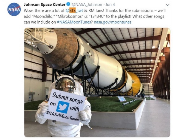 Viết trên Twitter, đại diện của Trung tâm vũ trụ Johnson cho biết: "Wow, có rất nhiều fan của BTS & RM. Cảm ơn vì đã gửi đề xuất bài hát. Chúng tôi sẽ thêm Moonchild, Mikrokosmos và 134340 vào danh sách phát nhạc".