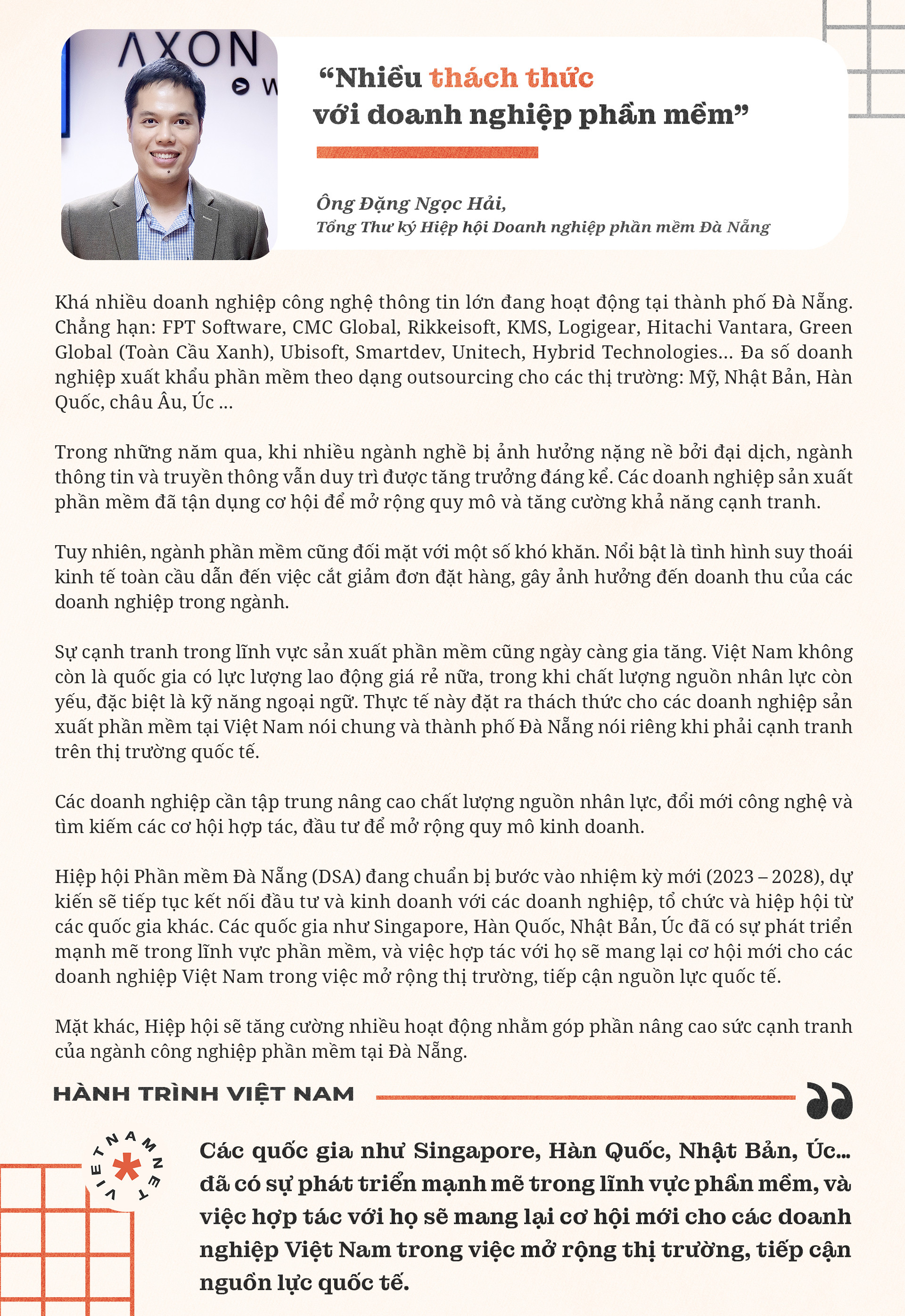 Nhiều năm đồng hành cùng doanh nghiệp, ông Hải hiểu khá rõ những khó khăn chồng chất khó khăn đối với doanh nghiệp công nghệ thông tin ở Đà Nẵng, đặc biệt là những doanh nghiệp có hoạt động kinh doanh quốc tế.