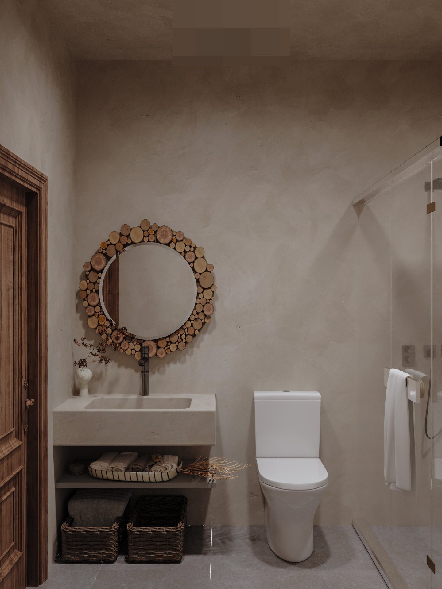 Phòng tắm đẹp, có khung cửa sổ nhìn ra vườn mini. Bên ngoài vườn là tường gạch lỗ thông gió, lấy ánh sáng cho phòng tắm nhưng vẫn đảm bảo sự kín đáo, riêng tư. Bồn tắm bằng bê-tông dẻo màu xám giống màu sơn phòng khách. Mảng tường bồn rửa mặt ốp đá rối sạch sẽ.