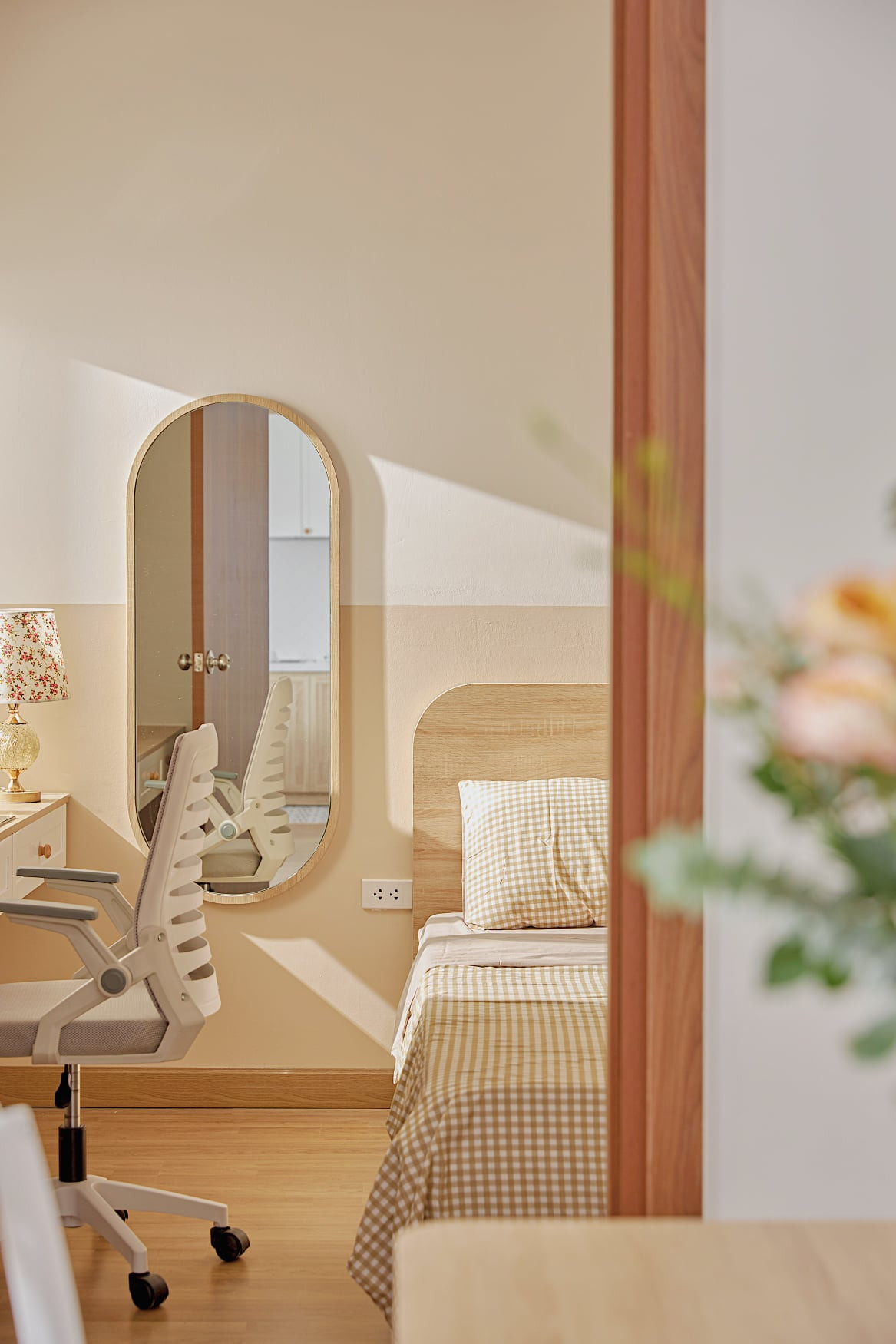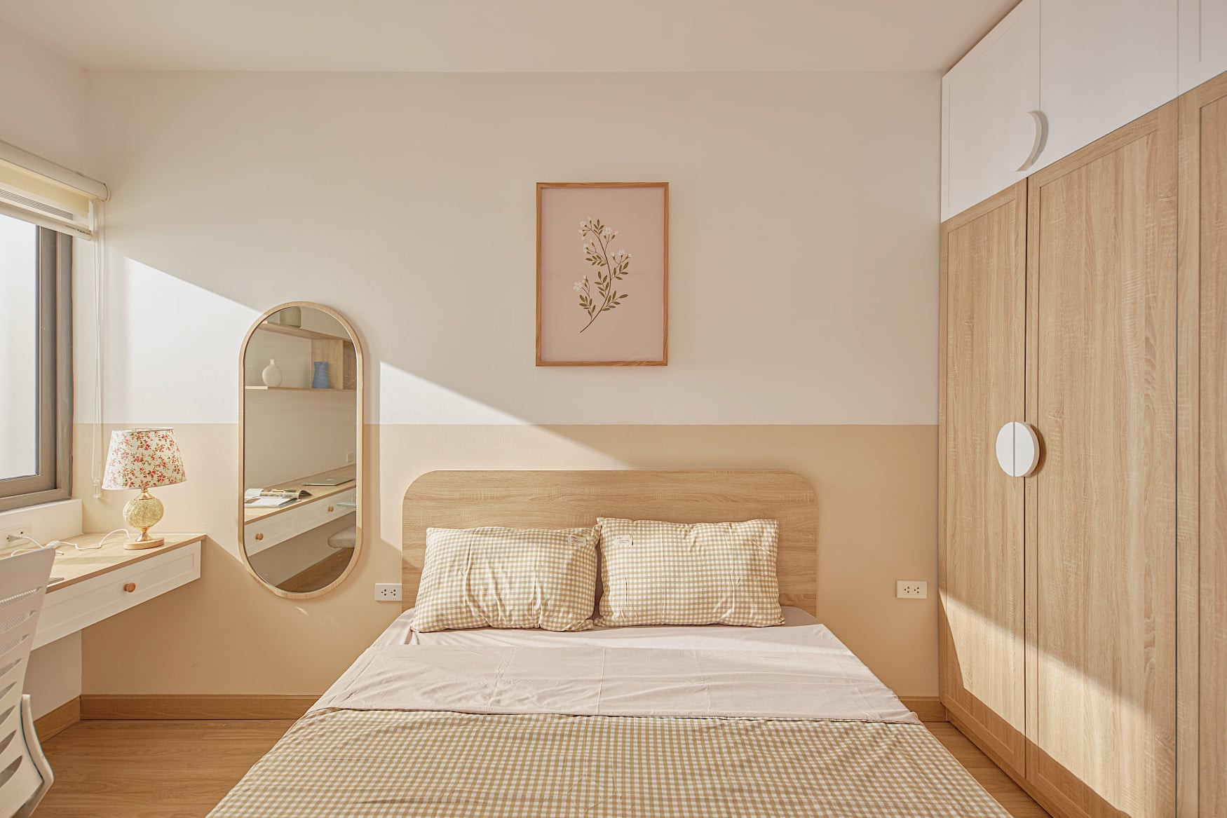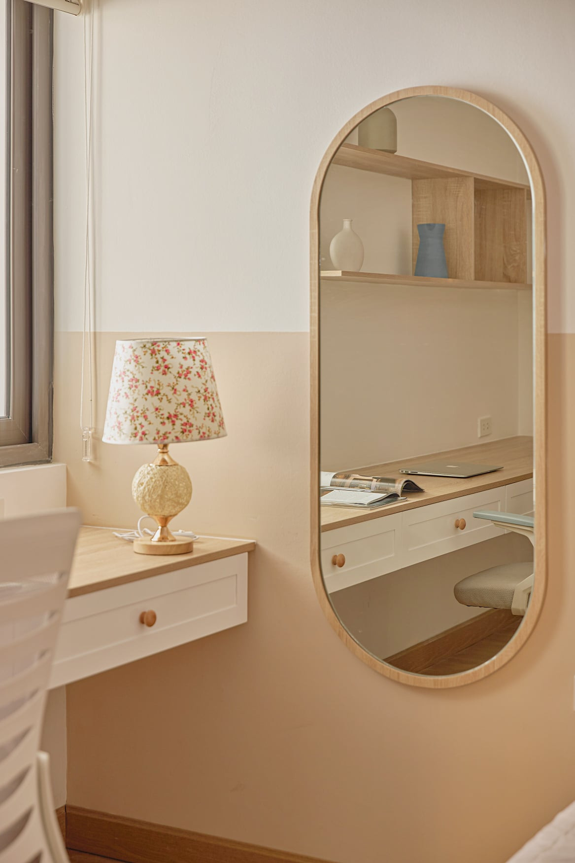 Chiếc bàn làm việc còn kiêm luôn bàn trang điểm, chiếc gương bầu dục đẹp mắt, tạo nên sự đồng điệu với nội thất khác.