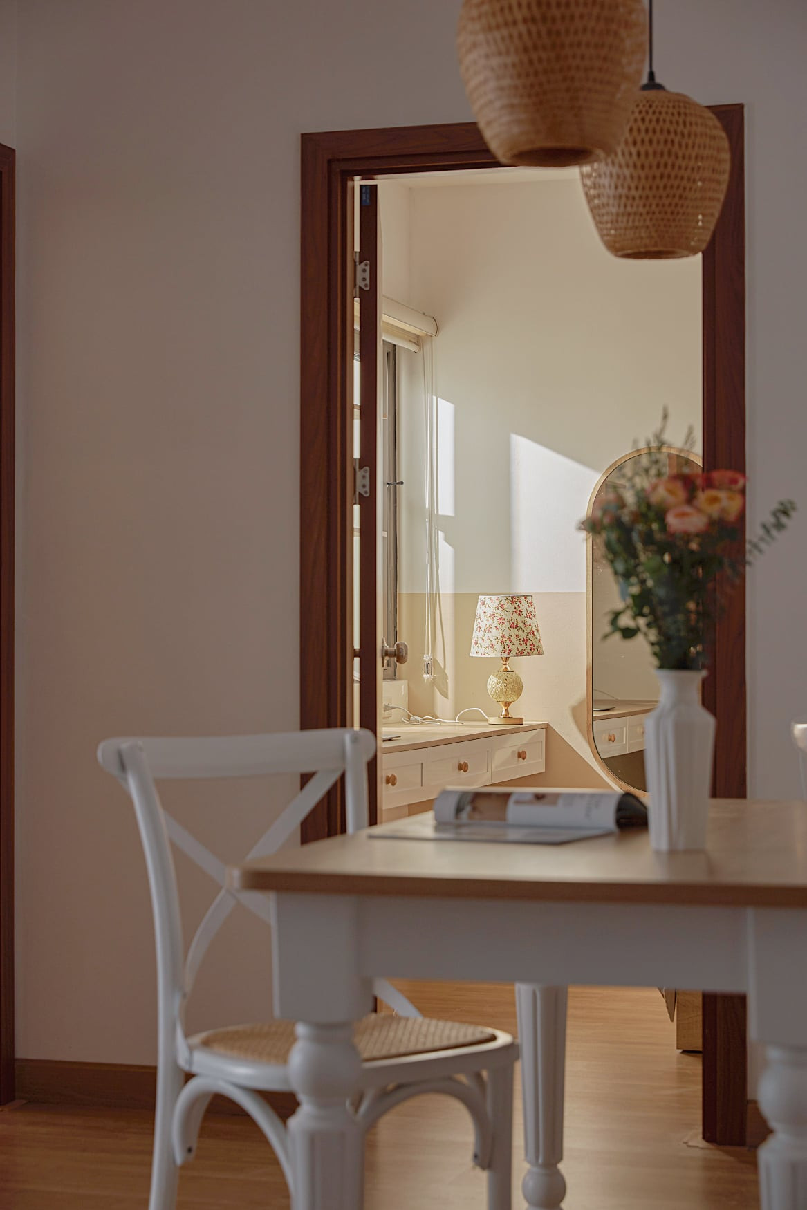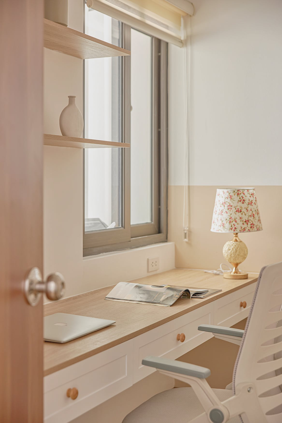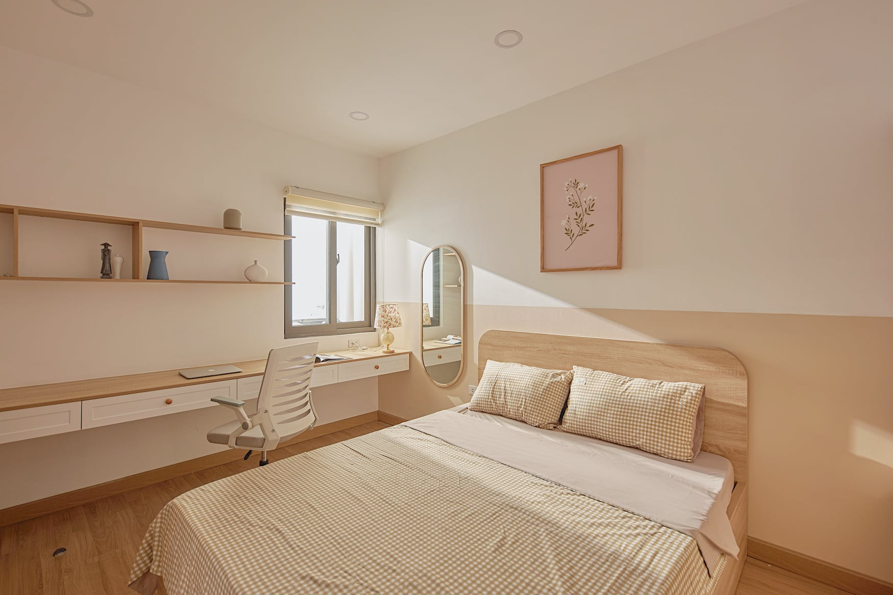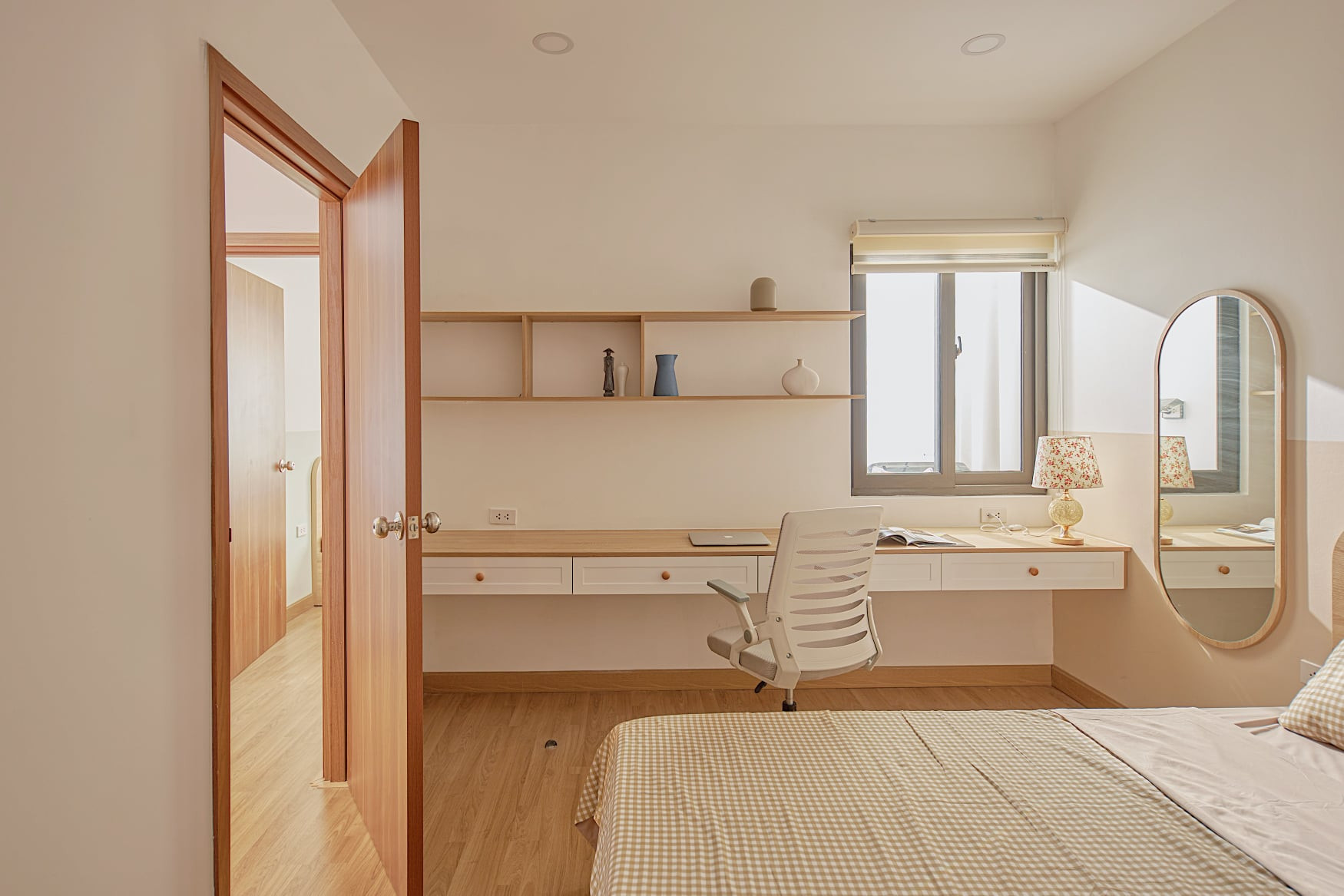 Phòng ngủ có nắng chan hòa, góc bàn làm việc bên khung cửa thật lãng mạn.