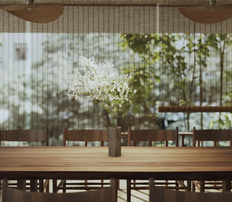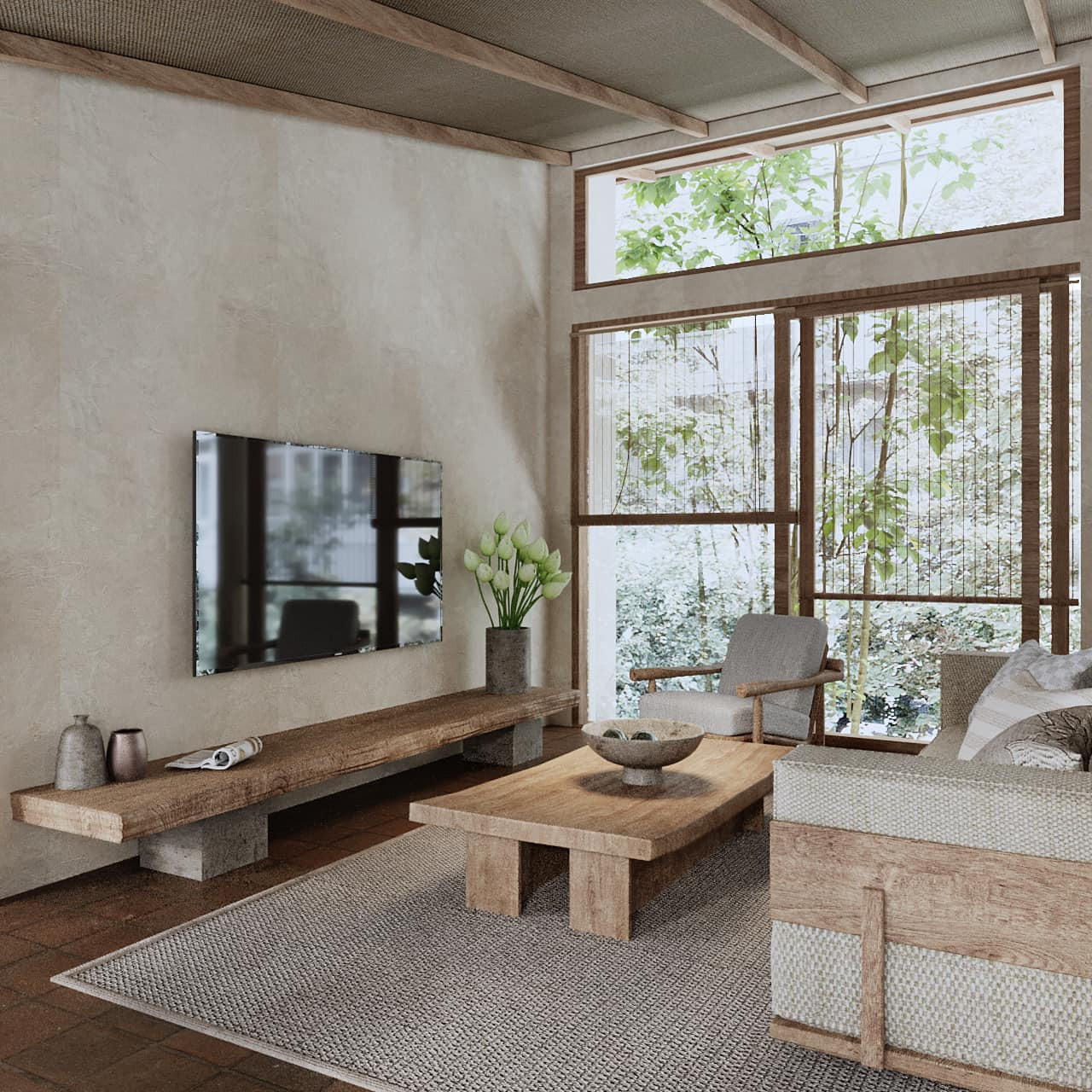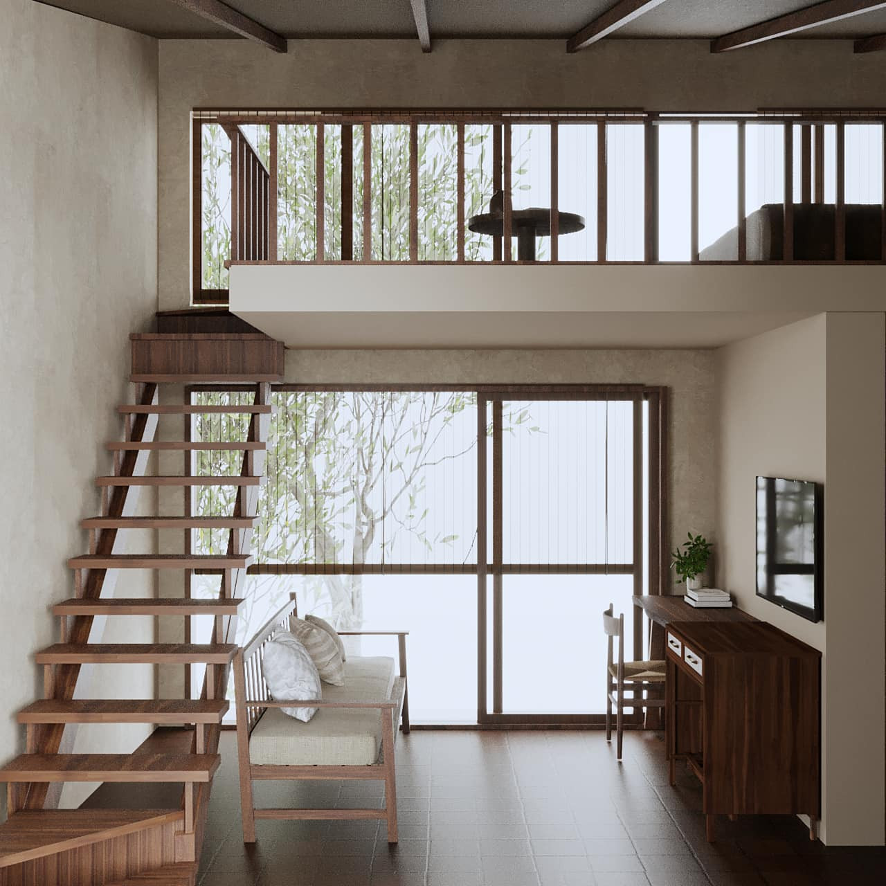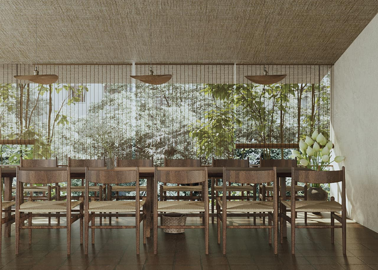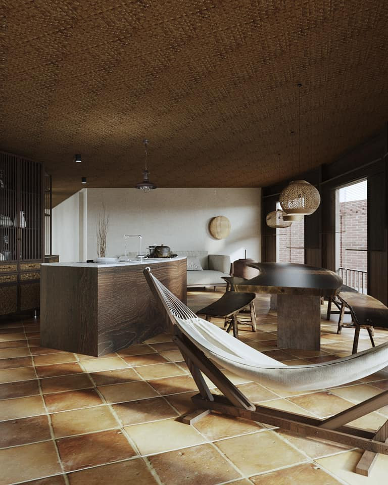 Căn nhà dùng tre trang trí mặt tiền, cây xanh trải khắp không gian