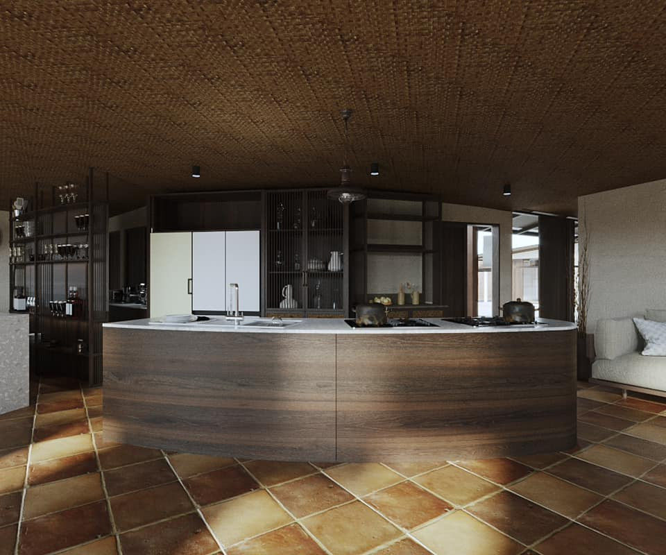 Với tinh thần thiết kế mở nên các không gian sinh hoạt chung có sự kết nối với nhau. Khu bếp rộng để gia chủ tiếp đãi bạn bè, người thân vào những dịp đặc biệt hay lễ, tết.