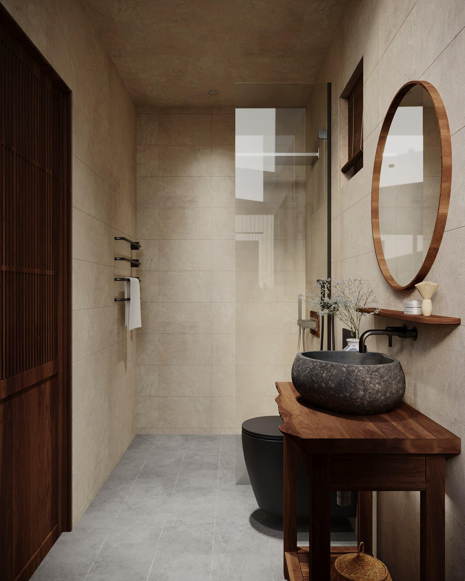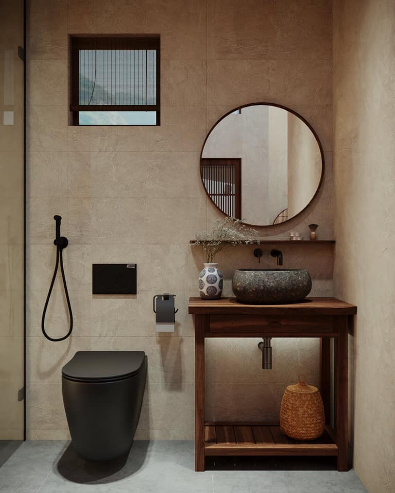 Phòng vệ sinh sử dụng chất liệu gỗ, đá. Thiết kế mộc mạc, đơn giản nhưng không bị nhạt nhòa. Màu sắc tương phản đen, trắng, nâu gỗ nổi bật dưới ánh đèn vàng.