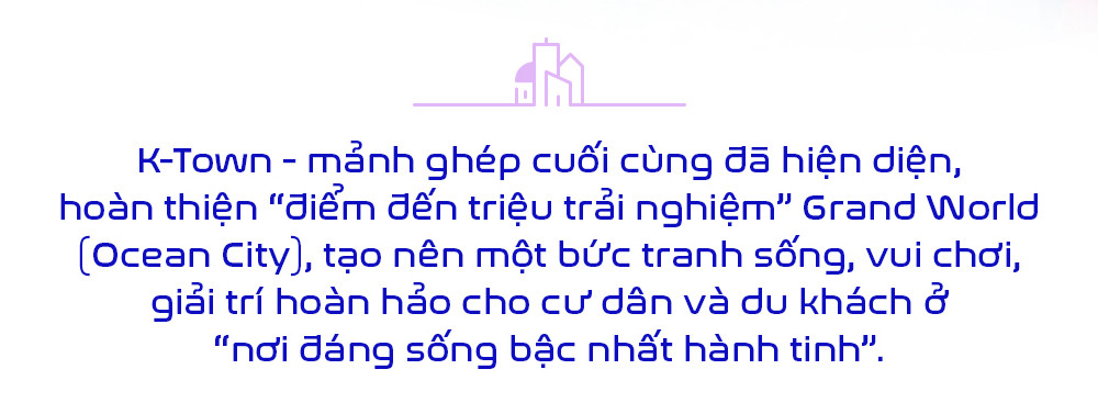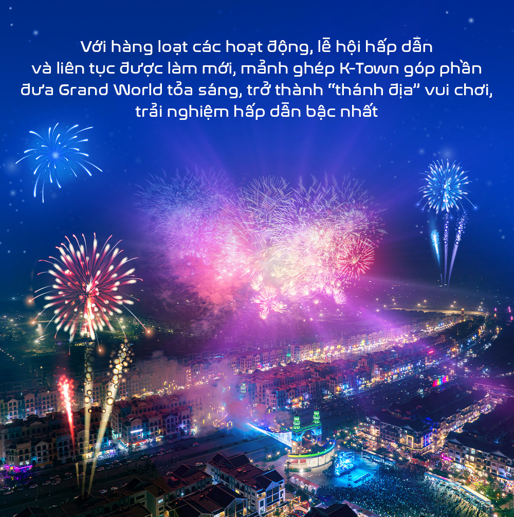 Ngày 26/4, K-Town chính thức ra mắt, hoàn thiện “điểm đến triệu trải nghiệm” Grand World. Trong chuỗi sự kiện khai trương, hàng vạn du khách đến với Ocean City đã được chứng kiến những màn biểu diễn mãn nhãn mang đậm dấu ấn văn hóa xứ Hàn, như biểu diễn Hanbok, múa cổ truyền, cho tới những cuộc thi Dance cover sôi động...