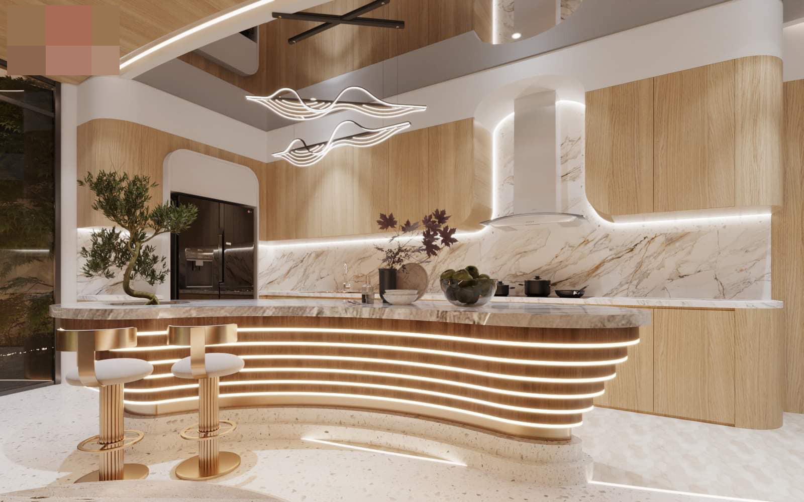 Khu bếp với bàn đảo cong mang biểu tượng chiếc thuyền vươn khơi. Thân bàn gắn đèn led rực rỡ.