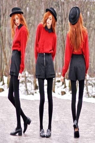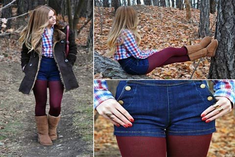 | Sơmi caro + shorts jeans + legging đỏ mận, kết hợp cùng những item thật ấm áp như áo choàng lót lông và UGG boots mang lại cái đẹp ấm áp của những ngày Noel lạnh. |