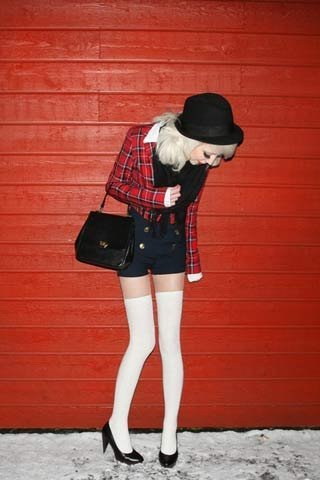 | Cũng là đỏ-đen, nhưng thêm một đôi tất cao cổ màu trắng và thay giày loafer bằng giày cao gót là cô bạn này đã có ngay vẻ ngoài thật nữ tính và cuốn hút. |