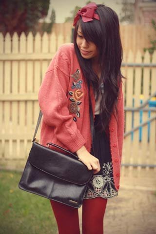 | Giáng sinh với vintage style hoàn hảo: cardigan, legging và băng đô đỏ, mini skirt xanh tím than, cardigan len và một chiếc túi da cổ điển. Những họa tiết thêu hoa tương đồng trên áo khoác và váy, kèm theo đó là sự sắp đặt rất hợp lí các sắc thái của màu đỏ đã khiến cô bạn này có một street style vô cùng tinh tế. |
