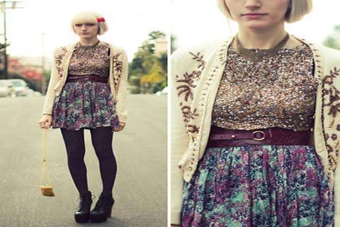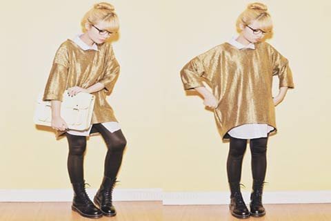 | Cô bạn này thì lại chọn cách mix điệu đà hơn nhưng cũng không kém phần thú vị khi mix áo ánh kim với mini skirt in hoa, legging chấm bi và lita boots. Đặc biệt là chiếc cardigan của bạn ấy cũng có những chi tiết ánh kim rất ăn ý với áo bên trong đấy nhé! |