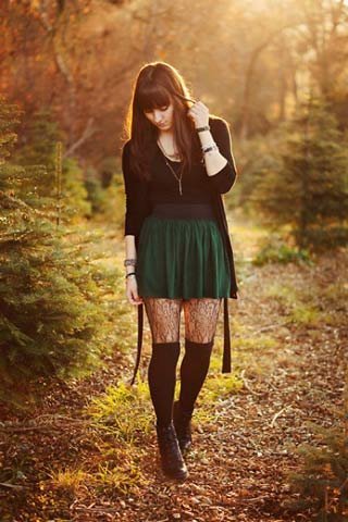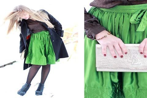 | Cả hai cô bạn này đều chọn cách mix chân váy xanh với những item màu tối khác. Tuy nhiên, trong khi cô bạn ở trên trông khá trẻ trung với legging ren, tất cao cổ và combat boots thì cô bạn phía dưới này lại thật thanh lịch và tinh tế với những trang phục chất lụa sang trọng, đi kèm legging chấm bi, lita boots và clutch ánh kim. |