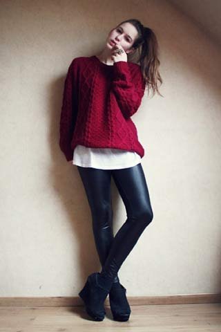 | Một gợi ý hay ho cho phong cách layering mùa Giáng sinh - áo pull len đỏ + sơmi trắng dáng dài + legging da và ankle boots đen. |