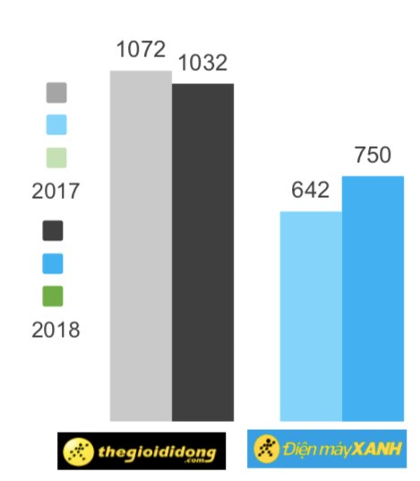 Tuy nhiên, điều đáng chú ý là tổng số cửa hàng Thế Giới Di Động và Điện máy Xanh năm 2018 chỉ nhiều hơn năm 2017 là 68 cửa hàng, từ 1.714 cửa hàng lên 1.782. Vậy doanh thu tăng thêm hơn 20 ngàn tỷ đồng đến từ đâu?