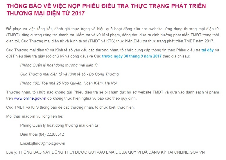 Cho nên Cục Thương mại điện tử và Kinh tế số yêu cầu các thương nhân, tổ chức cung cấp thông tin theo Phiếu điều tra tại đây và gửi Phiếu điều tra giấy (có chữ ký và đóng dấu) về Cục trước ngày 30/9/2017.