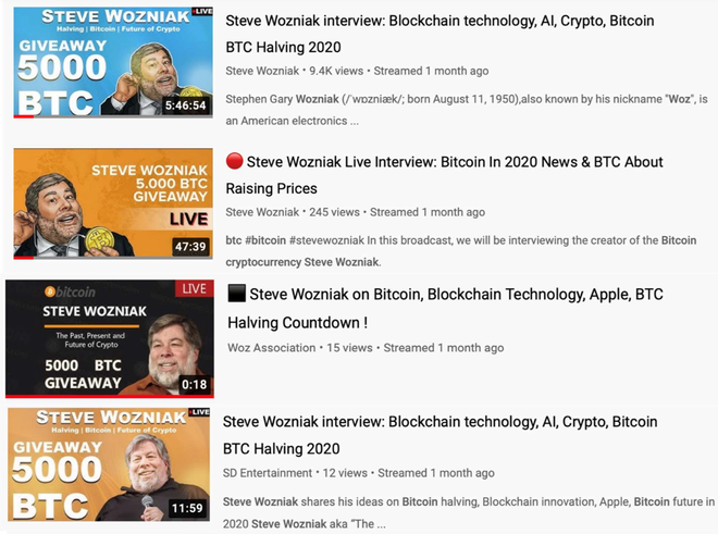 Cũng tương tự như trò lừa đảo xuất hiện trên Twitter vào tuần trước, những kẻ lừa đảo trên YouTube cũng đăng tải hàng loạt video tuyên bố rằng Wozniak đang tiến hành một chiến dịch quảng bá bitcoin, chỉ cần bạn gửi bitcoin đến địa chỉ ví được cung cấp, "Wozniak" sẽ gửi lại cho họ gấp đôi số tiền.