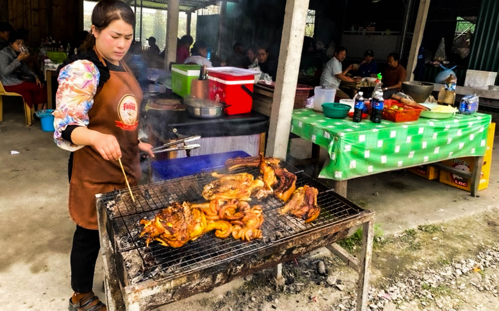 Thật ra, từ chiều thứ Bảy, những người bán hàng cố định lâu năm hoặc mở gian hàng ẩm thực Lào đã có mặt tại chợ để dựng lều quán, nửa đêm mổ heo gà, nướng thơm lừng cho kịp đón khách khi bình minh.