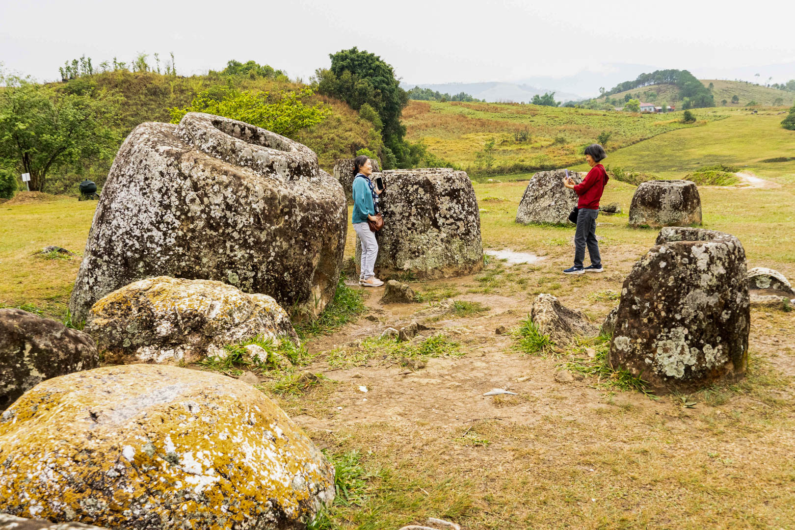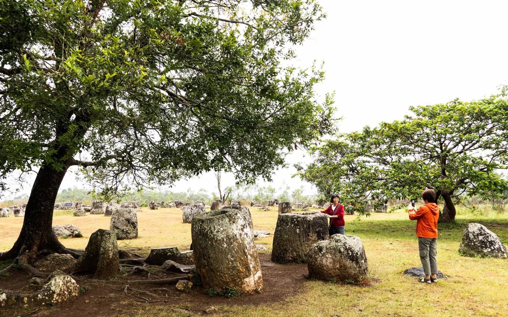 Vừa qua cổng kiểm soát vé, mọi ánh mắt của chúng tôi đều đổ dồn về hướng đỉnh đồi. Nơi đó có hàng trăm cái chum khổng lồ được đẽo gọt từ đá tảng nguyên khối, đa phần là granite, số ít sa thạch có niên đại khoảng 2.000 năm tuổi, với đủ kích cỡ và hình dạng vuông, tròn khác nhau nổi bật trên thảm cỏ xanh tươi.