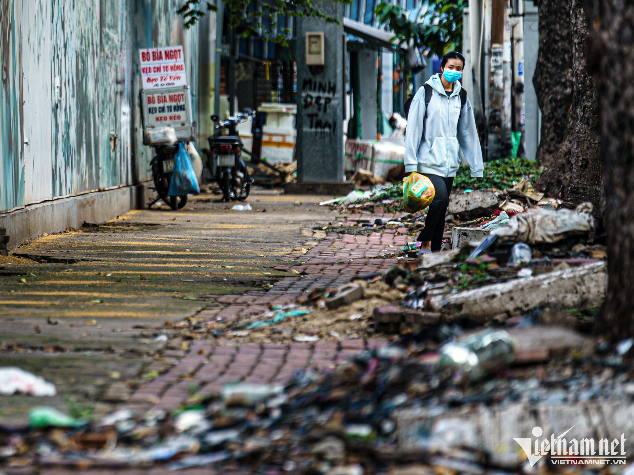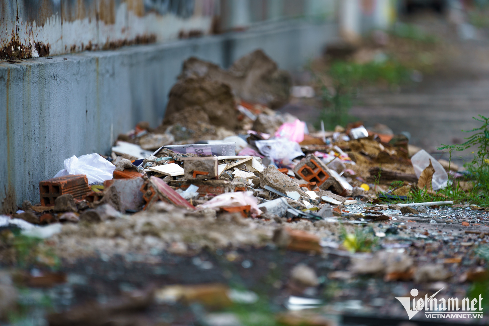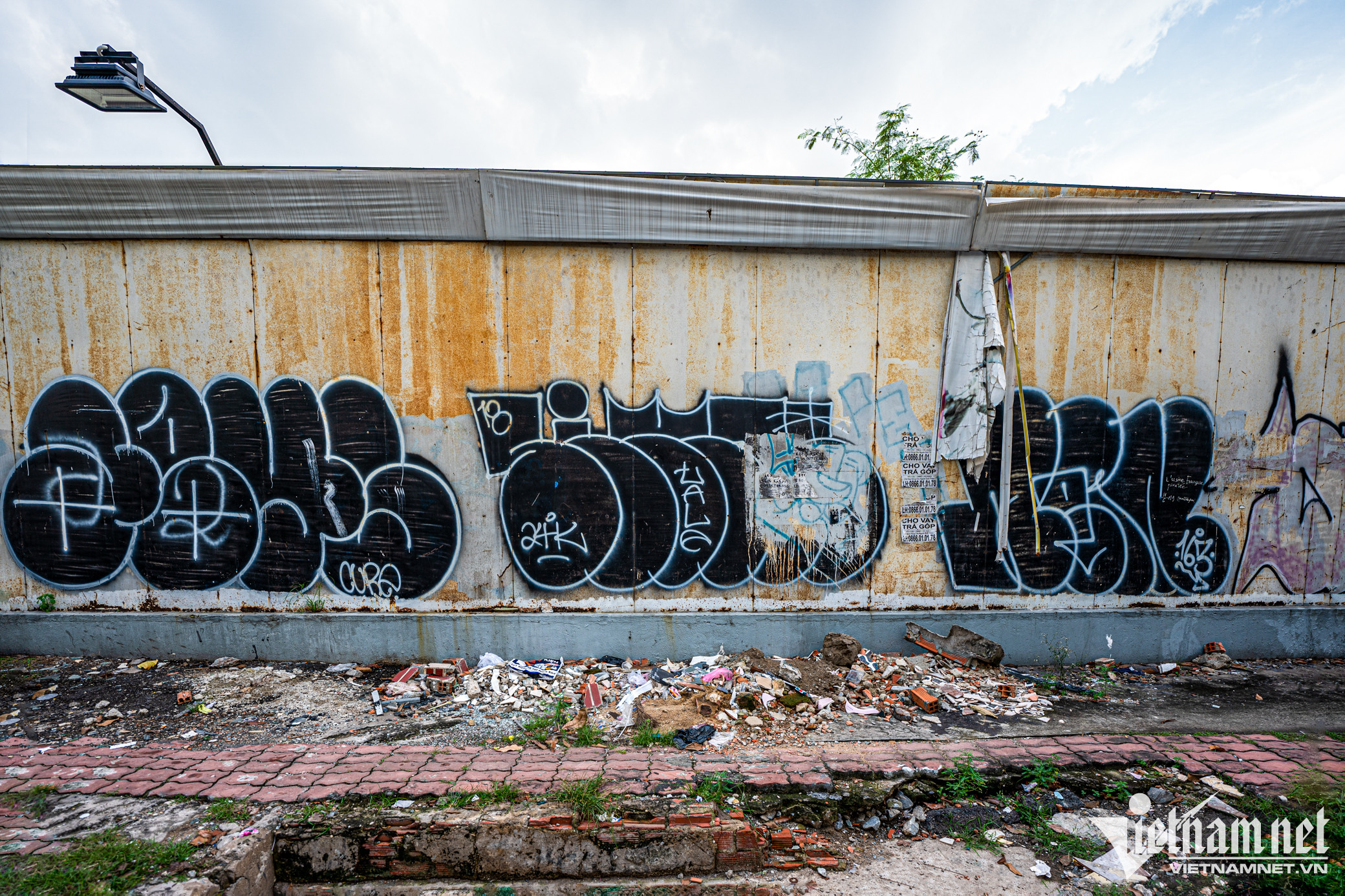 Phía bên ngoài, mặt tôn rào bị bôi bẩn, vỉa hè khu vực này bị hư hỏng do không được bảo trì thường xuyên, khá nhếch nhác.