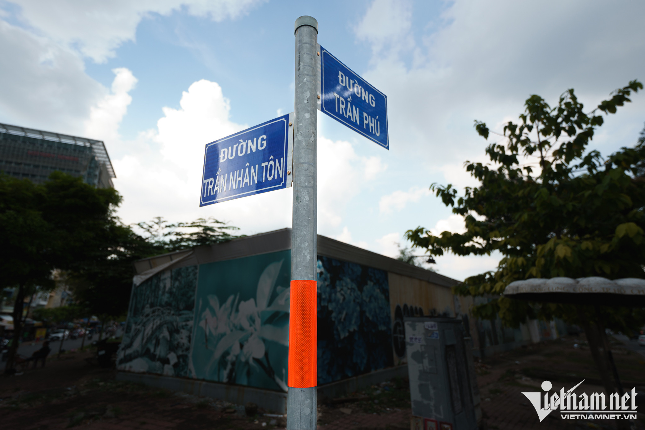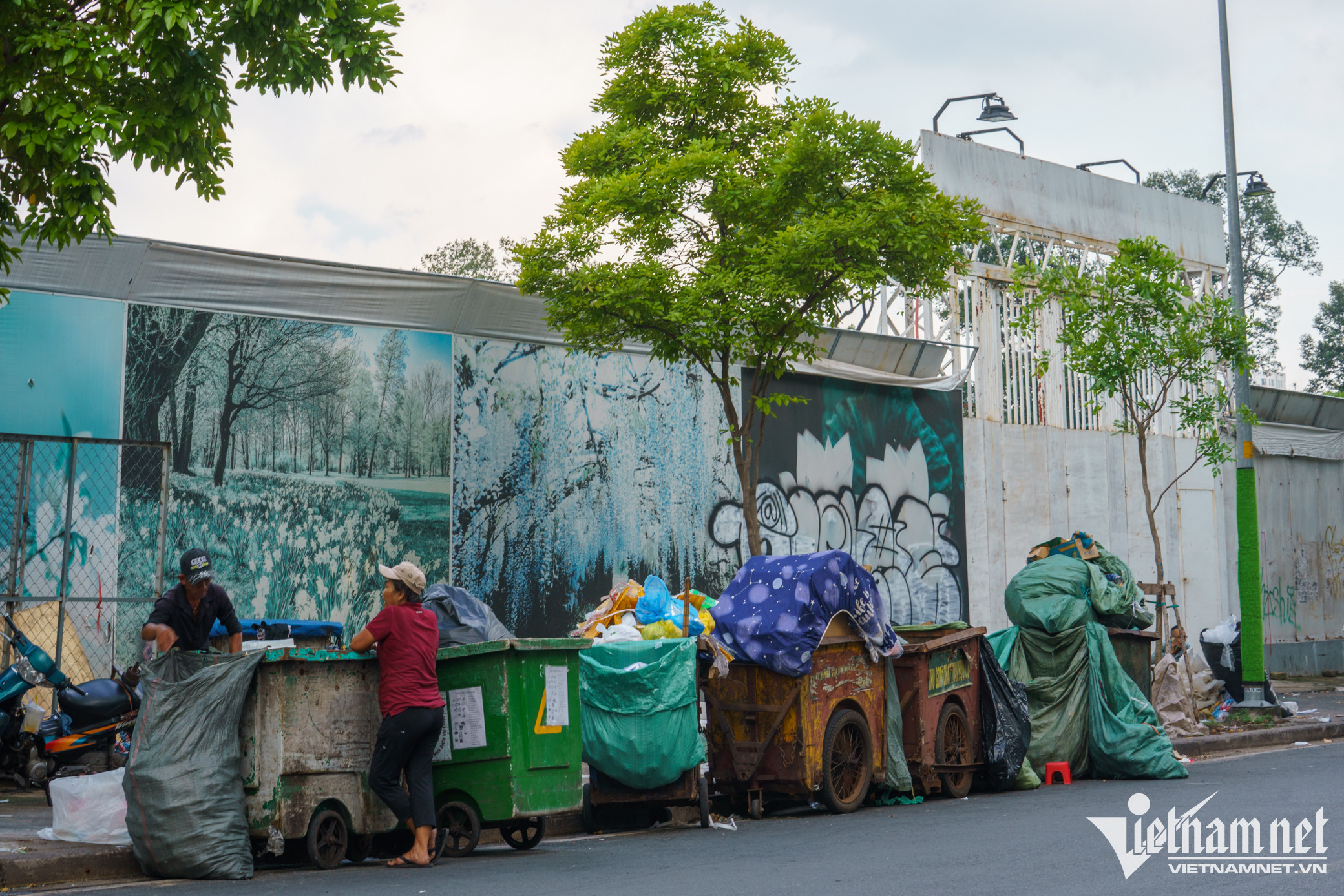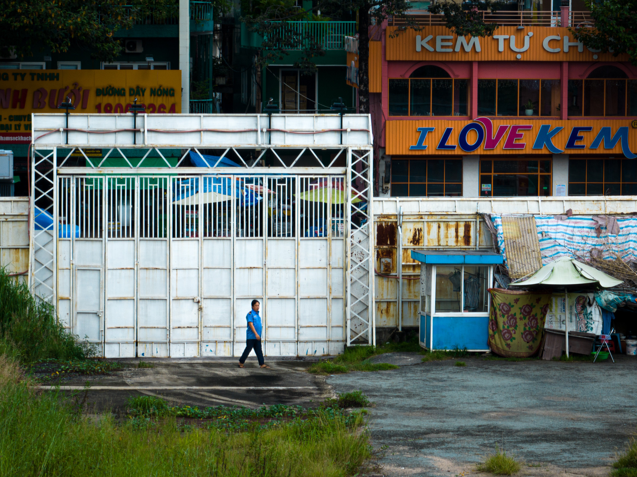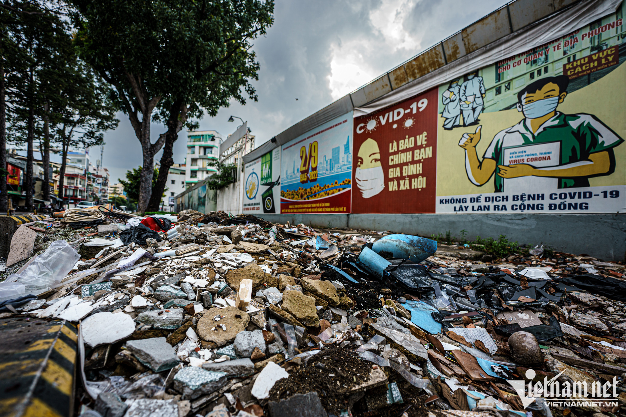 Phía bên ngoài, mặt tôn rào bị bôi bẩn, vỉa hè khu vực này bị hư hỏng do không được bảo trì thường xuyên, khá nhếch nhác.
