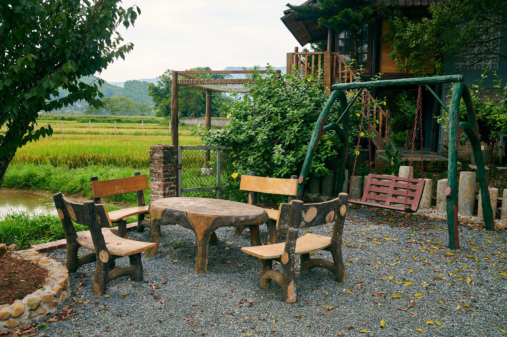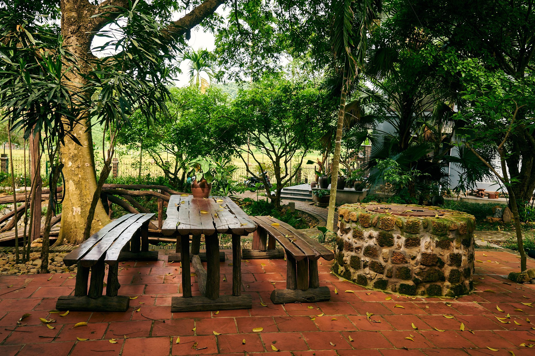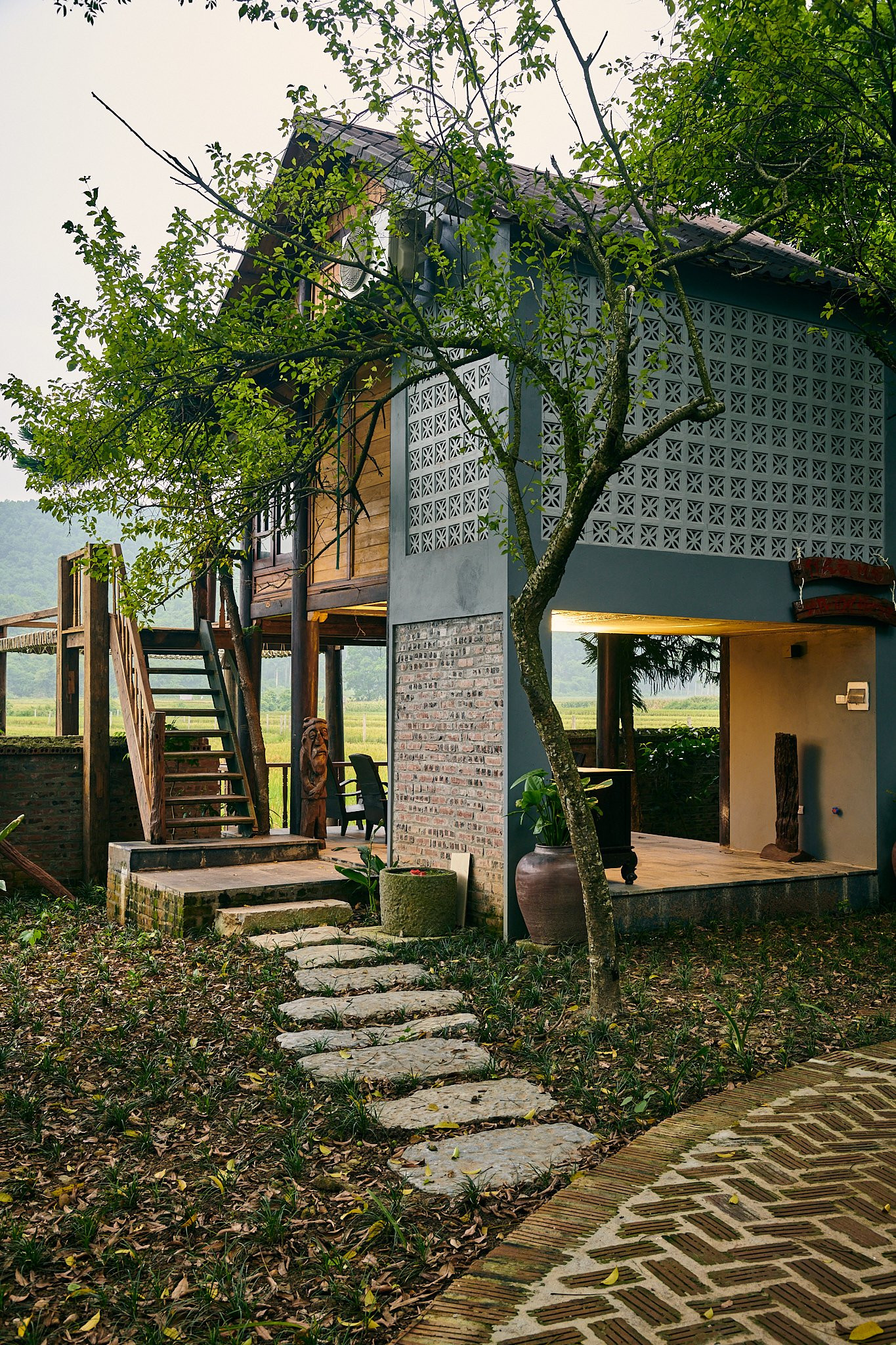Cả khu đất được xây dựng trên tinh thần thuận theo tự nhiên, hạn chế tối đa việc chặt phá cây cối trong vườn, đồng thời tận dụng lại và tái chế những đồ đạc thủ công, thân thiện với thiên nhiên.