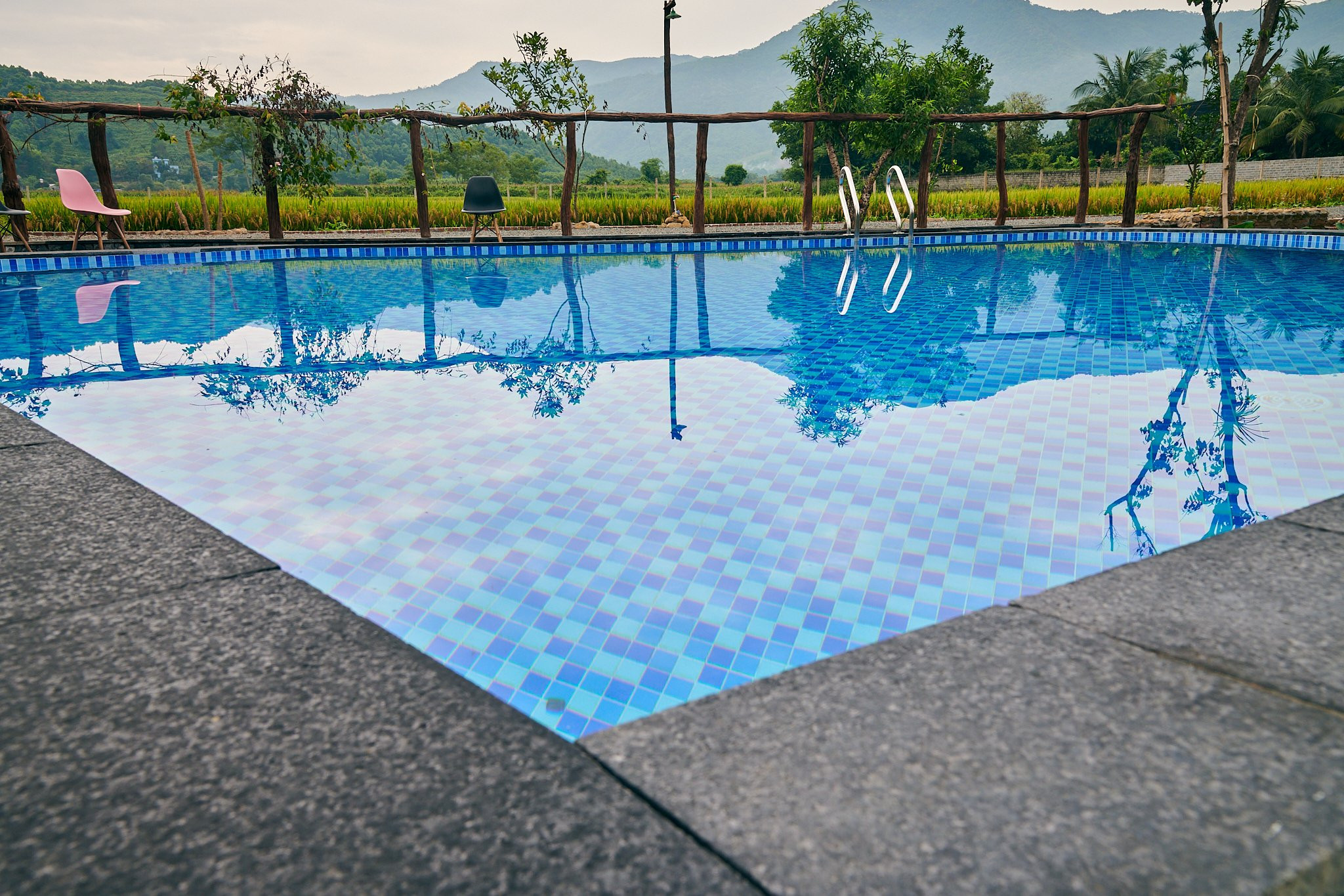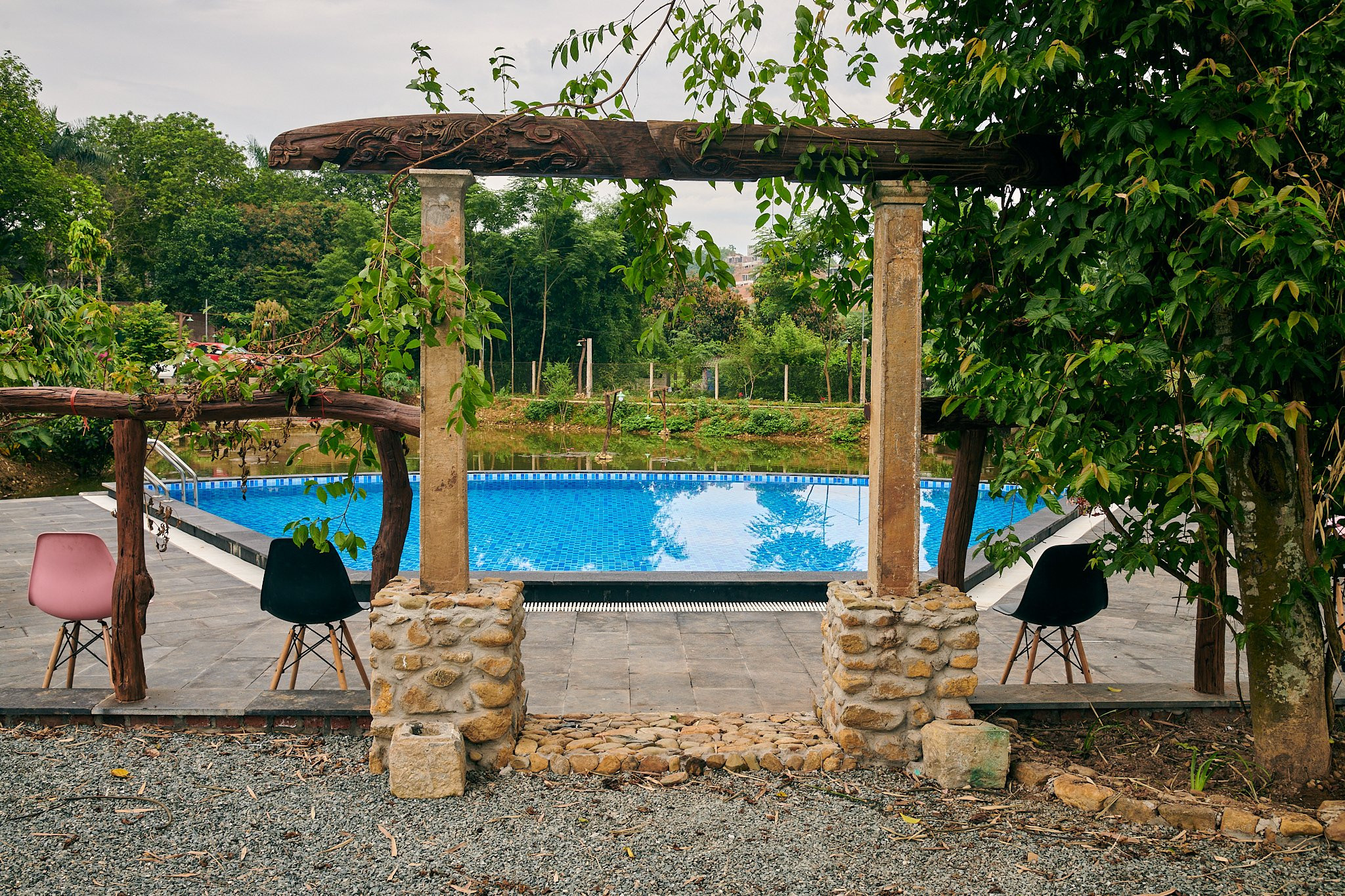 Hồ bơi rộng cho đại gia đình thư giãn, nghỉ ngơi và vui vẻ cùng nhau. Cổng vào bể bơi được trang trí bằng cột đá và kèo gỗ do mẹ Việt Anh lùng được.