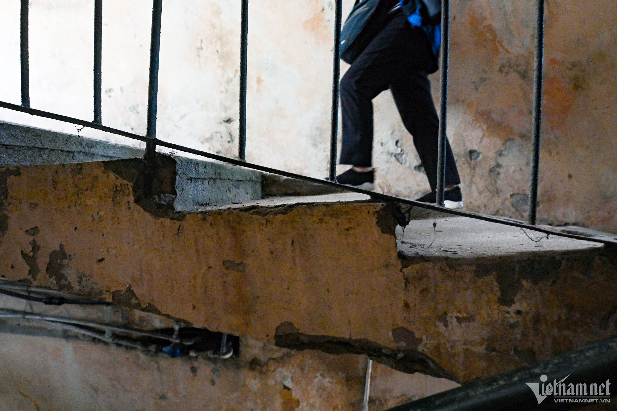 Giống với nhiều dãy nhà khác tại tập thể Nghĩa Tân, cầu thang tại dãy D1 luôn trong tình trạng tay vịn lỏng lẻo, lối đi sứt mẻ.