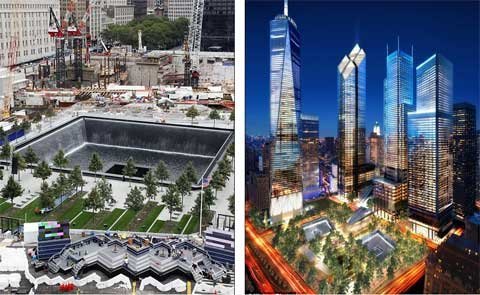 Khu vực đài tưởng niệm và các tòa nhà xung quanh đang mọc lên (ảnh trái) và khi các cao ốc gần đài tưởng niệm hoàn thành (phải)