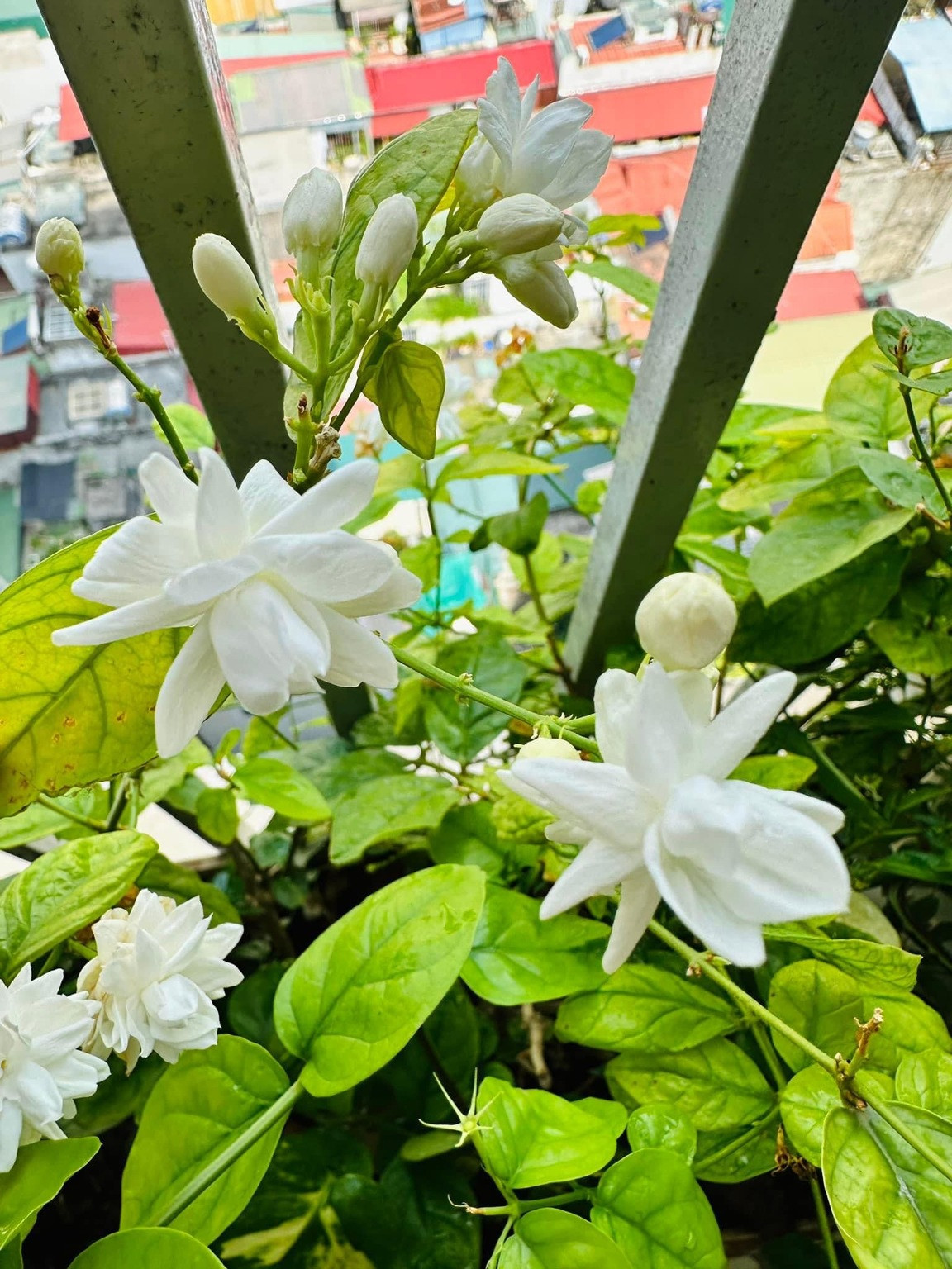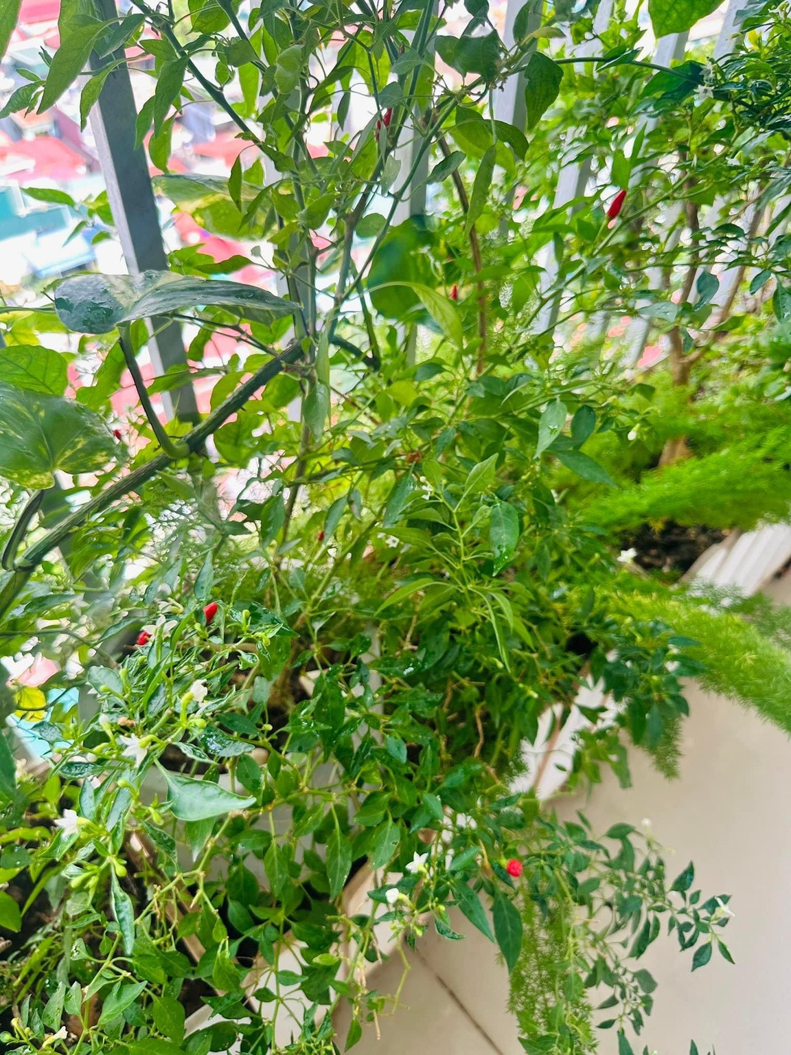 Góc ban công nhà Hoàng Trang ngập tràn hoa lá và cây cối xanh tươi. Cô lựa chọn những giống cây phù hợp với không gian sống, dễ chăm sóc và tạo cảm giác thư thái, bình yên sau mỗi ngày làm việc căng thẳng.