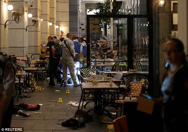 Các tay súng mặc comple tối màu đã tấn công khủng bố một quán cà phê ở Tel Aviv, Israel hôm 8/6 làm ít nhất 4 người thiệt mạng.