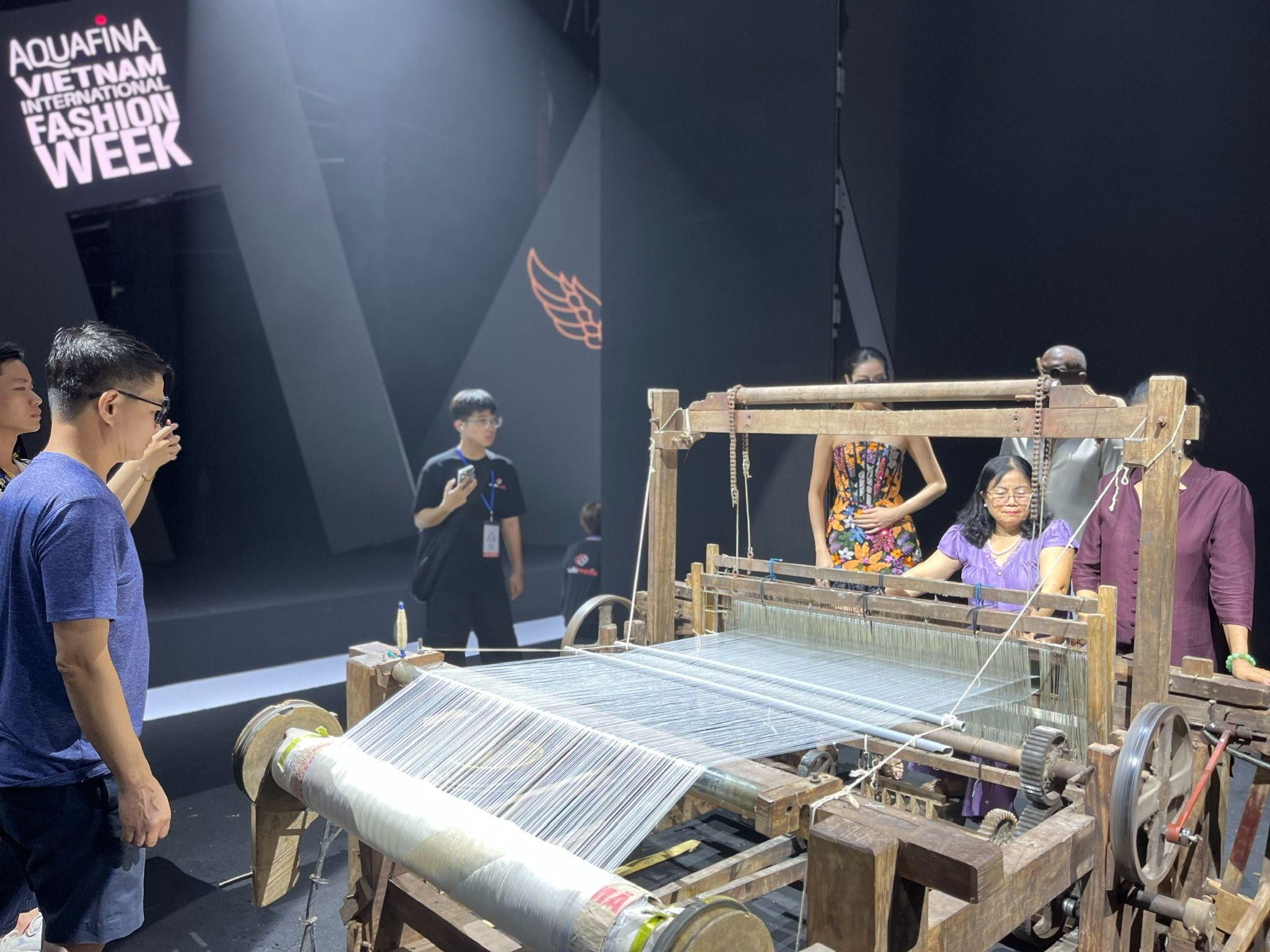 Là một điểm nhấn ấn tượng trong chương trình bế mạc tuần lễ thời trang AVIFW vào tối ngày 23/7, sự xuất hiện của khung dệt 100 năm tuổi ngay trên sân khấu khi người mẫu đang trình diễn các bộ sưu tập đem đến nhiều cảm xúc.