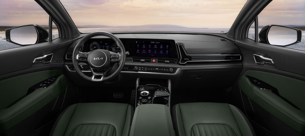 Bước vào khoang cabin của Kia Sportage 2024 là sự kết hợp giữa màu xanh lá cây và đen dành riêng cho bản kỷ niệm 30 năm. Ghế bọc da cao cấp hơn, với tựa đầu của hàng ghế trước dập nổi huy hiệu “30 Sportage”.