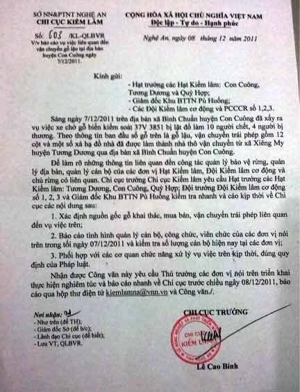 Trước đó, ngày 8/12/2011, ông Lê Cao Bính, Chi cục trưởng Kiểm lâm tỉnh Nghệ An đã có văn bản số 603/KL-QLBVR với nội dung liên quan đến vụ xe chở gỗ gây tai nạn thảm khốc: Để làm rõ những thông tin liên quan đến công tác quản lý bảo vệ rừng, quản lý địa bàn, quản lý các cán bộ của các đơn vị hạt kiểm lâm; Đội kiểm tra cơ động và các chủ rừng có liên quan. Chi Cục trưởng Chi cục Kiểm lâm yêu cầu Hạt trưởng các Hạt Kiểm lâm Tương Dương; Con Cuông; Quỳ Hợp; Đội trưởng đội Kiểm lâm cơ động số 1, 2, 3 và Giám đốc Khu Bảo tồn thiên nhiên Pù Huống kiểm tra nhanh và báo cáo. Xác định rõ nguồn gốc gỗ khai thác, mua bán, vận chuyển trái phép liên quan đến vụ việc nói trên. Báo cáo tình hình quản lý cán bộ, công chức, viên chức của các cán bộ nói trên trong tối ngày 7/12/2011 và kiểm tra số lượng cán bộ hiện nay trong đơn vị. Phối hợp với các cơ quan chức năng xử lý vụ việc trên kịp thời, đúng pháp luật. |