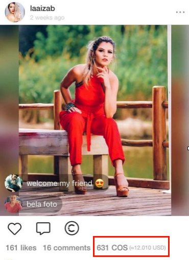 Hotgirl thời trang Laiza Bastos (@Laaizab) đăng một bài viết trên PhotoGrid đã nhận được 6.300 lượt like, tổng cộng đào được 15.217 COS, tương đương khoảng 650 USD.
