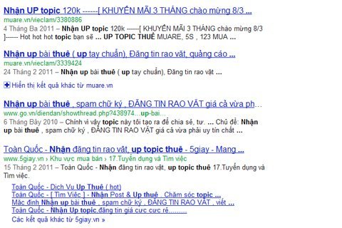 Công việc chỉ đơn giản là lập một nick ảo và rồi post một vài dòng bất kỳ, giữ cho topic của chủ thuê luôn ở trang đầu của kênh bán hàng ấy là hoàn thành nhiệm vụ. Tuy vậy, mọi việc cũng không đơn giản bởi chỉ lơi đi một chút là topic trôi tuột xuống dưới, người thuê phát hiện ra là lại kêu la. Giá cả cho dịch vụ này phụ thuộc thời gian cũng như yêu cầu đặt ra, thường dao động khoảng 800 ngàn đến 1 triệu/tháng.