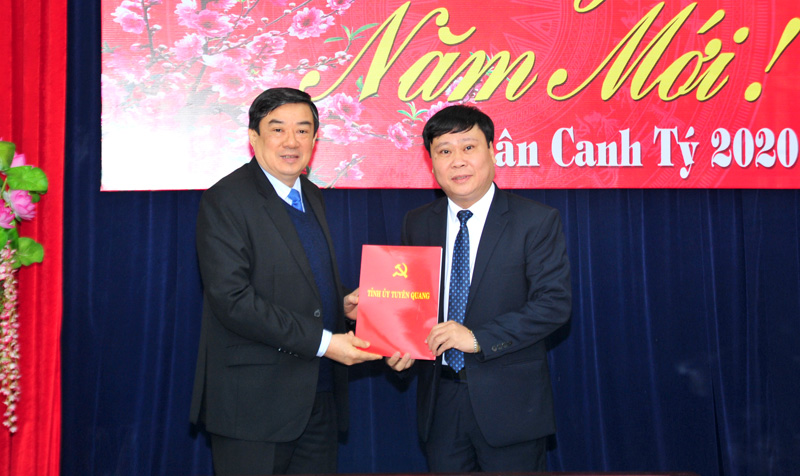 Phó Bí thư Thường trực Tỉnh ủy Tuyên Quang Nguyễn Hồng Thắng trao quyết định và chúc mừng ông Mai Đức Thông. |