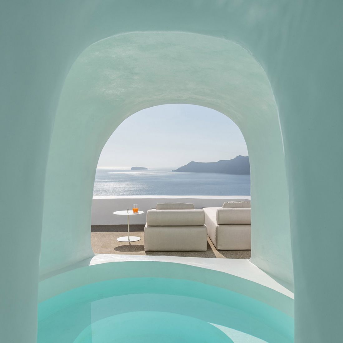 Khách sạn Saint, Hy Lạp được xây dựng dựa vào một sườn đồi đá ở Santorini để tạo ra các dãy phòng giống như hang động của Saint Hotel, nơi có tầm nhìn không bị cản trở ra đại dương.