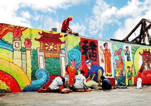 Ðoạn tranh gốm đầu tiên là của nghệ sĩ Ðan Mạch Ghết-xen thực hiện tháng 3/2008. Ðây là đoạn tranh nằm trên bức tường đê đối diện bến xe Long Biên, mang phong cách đương đại. Ðến tháng 6/2009, nghệ sĩ Pháp Ðô-mi-ních đờ Mi-xcôn thực hiện đoạn tranh gốm với chủ đề sử thi "Ðẻ đất đẻ nước" của dân tộc Mường ở Hòa Bình.