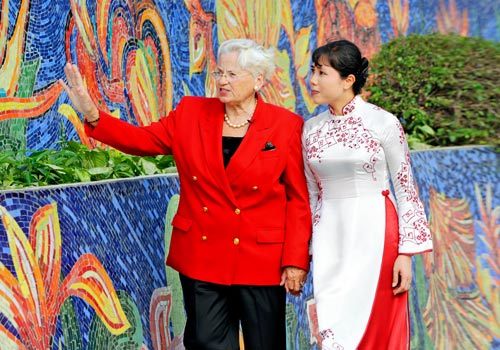 Họa sĩ New Zealand Ana Tzarev và họa sĩ Nguyễn Thu Thủy thăm đoạn tranh gốm do bà thiết kế. Ảnh: VnExpress