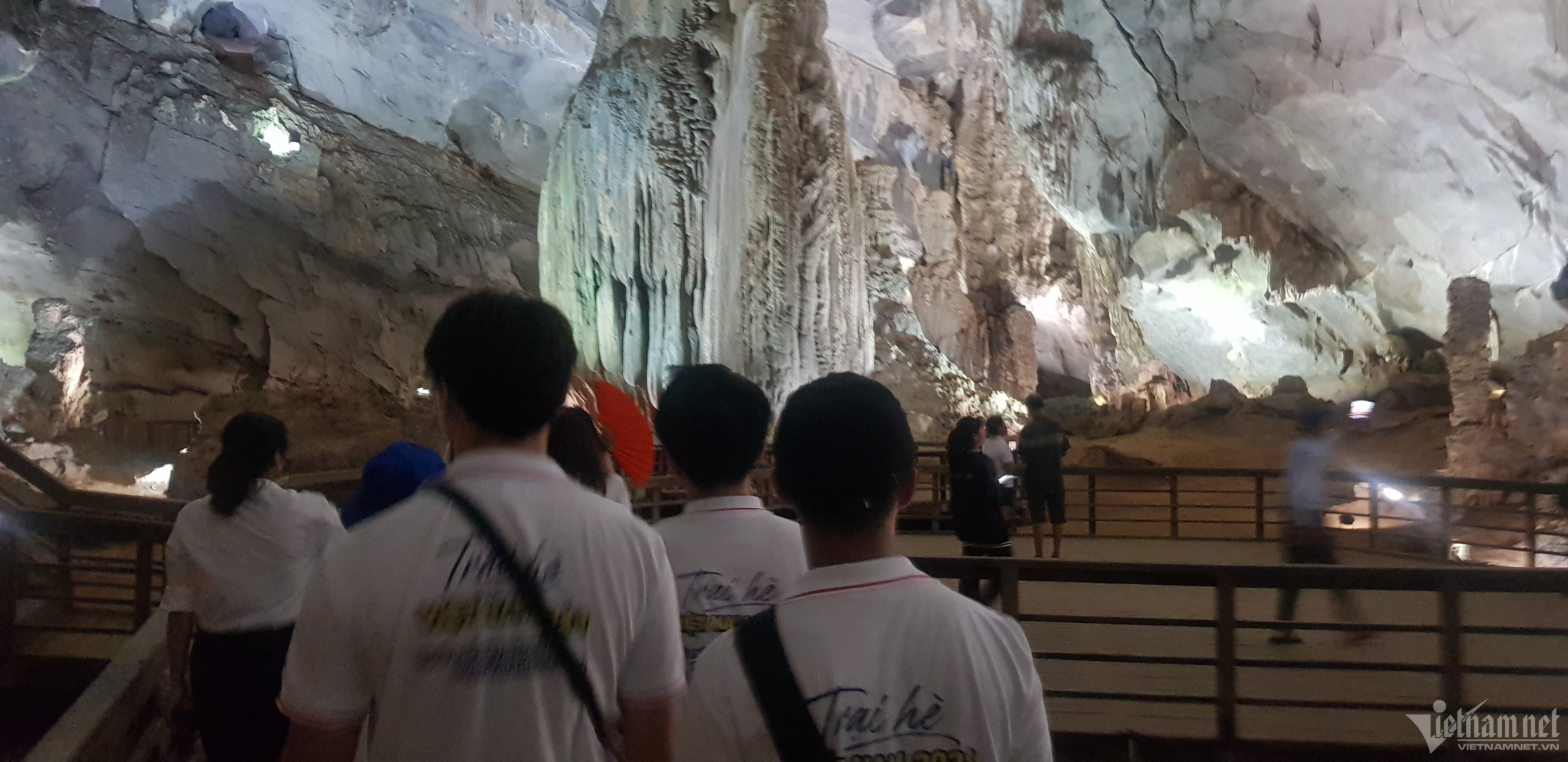 Đoạn đường bộ trong động, giúp du khách có nhiều cơ hội chạm vào thạch nhũ. Các kiều bào trẻ vui vẻ chụp ảnh kỷ niệm tại nơi này.