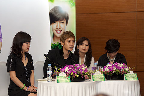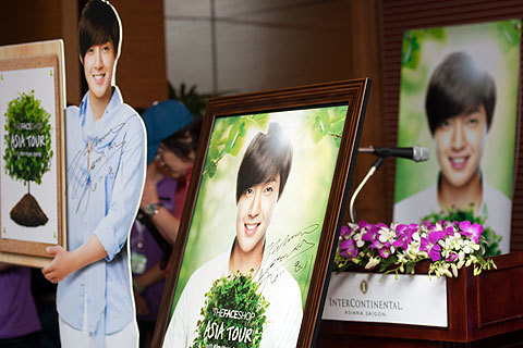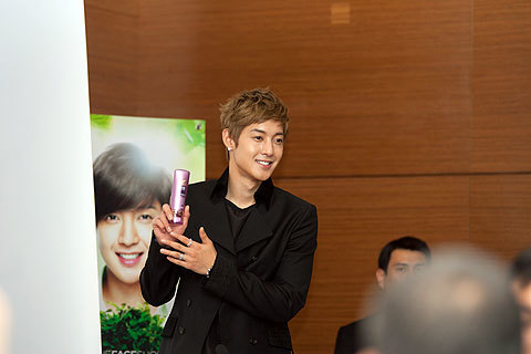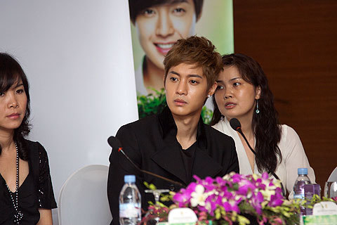 Và ngay trong buổi gặp gỡ báo chí vào sáng ngày 11/7, anh tiếp tục thể hiện thái độ có phần lạnh lùng ấy. Suốt buổi họp báo, Kim Hyun Joong rất ít khi cười. Gương mặt của thành viên SS501 chỉ giãn ra khi đứng lên giới thiệu về sản phẩm mà anh đại diện và ký tên lên tấm hình của mình.