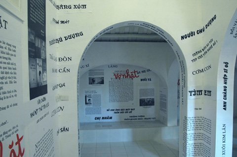 Tiếng chim cu gáy trong lồng treo bên hiên nhà, gió đưa mùi hoa vờn tóc giục ta trút bỏ ồn ã bộn bề để tĩnh lòng đến với Kim Lân. Thành Chương đã “bẻ ghi” cho tâm trạng người xem khi thiết kế lối vào hẹp, chỉ lọt một người, bước thẳng, đồ đạc giày dép bỏ bên ngoài. Theo lối đi có bậc khấc hút sâu, ta đến một thế giới khác, thế giới của trong trắng, thanh cao. Tài sản không có, nhà văn để lại tác phẩm và nhân cách. Di sản chữ của ông là tinh tuý vô giá. Những tác phẩm được con trai trưởng in ra giấy, các cỡ, font chữ khác nhau, bồi kín các bức tường, vòm của 4 gian nhà cột kèo, rui mè đều sơn trắng. Riêng tên Làng, Vợ nhặt – dấu son của đời văn Kim Lân được Thành Chương dùng sơn đỏ viết lên chữ đen tường trắng – cũng là “giấy trắng mực đen” có ấn tín một văn tài “thần mượn tay người để viết” (câu của nhà văn Nguyễn Khải đánh giá về hai tuyệt tác của Kim Lân). Màu trắng ấy tạo sự hư – thực, gần gũi mà huyền ảo, tường minh mà vô cùng. Màu trắng và nghệ thuật sắp đặt kết hợp với cách bài trí gian thờ, kiến trúc nhà truyền thống, là sự giao thoa cổ điển và hiện đại, thuần khiết và phá cách đúng tinh thần sống của Kim Lân. Chữ “Mặc hương” (mực thơm) treo gần ảnh đen trắng nhà văn cầm quạt cọ, mặc bộ đũi trắng ngoài tiền sảnh. Dùng mực đen giấy trắng, cốt cách nhân hậu, tình nghĩa, ngay thẳng – hồn cốt nhà văn đã được con trai hiểu để truyền tải “Kim Lân nhất”, làm nên sự đột phá có một không hai. Không phải nhà lưu niệm hay bảo tàng cần bày/ gắn với hiện vật, nơi đây chỉ tôn vinh chữ trong một miền trắng trong, thánh thiện.
