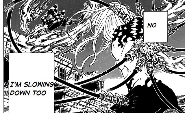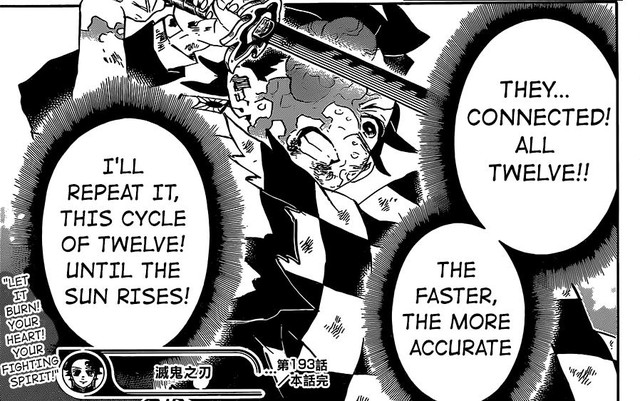 Phía Tanjirou, cậu vẫn đang cố gắng biểu diễn Hơi thở Mặt Trời nhanh và chính xác hơn nữa để có thể hình thành thức thứ 13. Dù rằng thể lực sắp cạn kiệt, Tanjirou vẫn quyết chí đến cùng. Kết thúc chương, khó có thể cân đo đong đếm bên nào chiếm lợi thế nhiều hơn, bởi lẽ Muzan đang yếu dần đi vì tuổi tác trong khi Tanjirou chưa đủ mạnh như Yoriichi để kết liễu Muzan ngay lập tức.