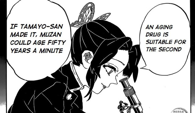 Phát hiện ra điều này, Muzan còn chưa kịp vui mừng thì gã bỗng chuyển động chậm lại. Muzan liền triệu hồi cô Tamayo và thông qua đó biết được, Tamayo và Trùng Trụ Shinobu từng hợp tác chế tạo thuốc. Theo đó, Trùng Trụ đã dự tính đến trường hợp thuốc biến quỷ thành người không có tác dụng và nâng cấp hiệu quả của thuốc thành lão hóa Muzan với tốc độ năm mươi tuổi một phút.