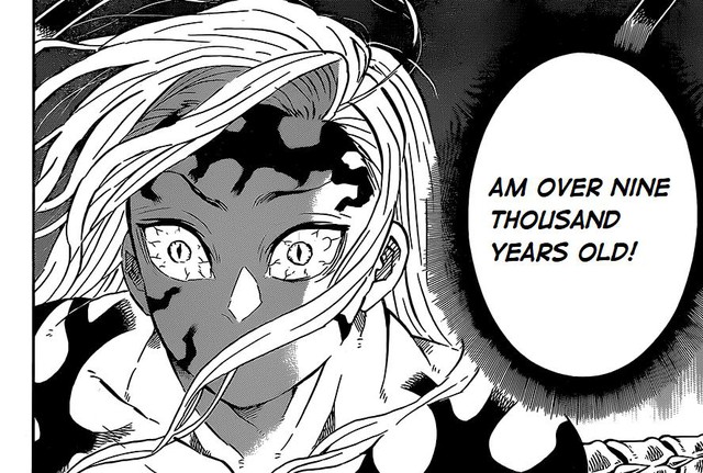 Từ khi giết Tamayo đến nay Muzan đã trải qua nhiều trận ác chiến với các Trụ cột suốt hàng giờ liền. Tương đương với chừng đó thời gian, gã già đi theo và đang có xu hướng yếu dần. Theo như Muzan tính toán, thuốc đã phát huy tác dụng được 3 tiếng nên gã đã chạm mốc 9000 tuổi. Muzan đáng lẽ có thể phát hiện điều này sớm hơn vì tóc gã đã bạc trắng từ lúc nào và không thể phục hồi như ban đầu nữa.