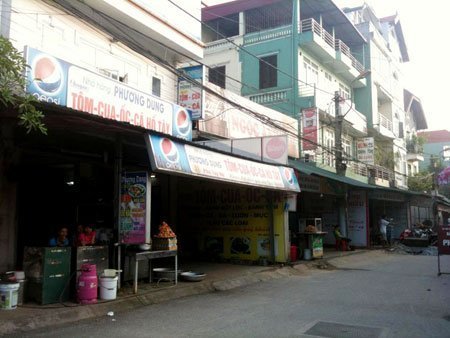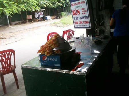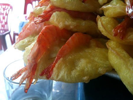 Đập vào mắt là một mâm bánh tôm cỡ lớn đặt ngay cạnh lối ra vào quán. Những chiếc bánh tôm vàng ươm được xếp lần lượt trên một chậu nhôm không hề có dụng cụ che đậy, để “lộ thiên” sát mép đường đi mặc cho hàng đoàn xe máy đi qua, xung quanh, vài chú ruồi vo ve thưởng thức. Nhìn kỹ trên mâm bánh tôm còn có sợi tóc không rõ của vì sao được cuốn quanh con tôm màu đỏ gạch.