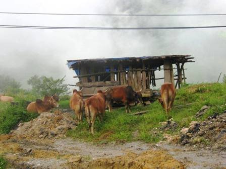Chúng tôi vào một khu tập kết trâu bò ven đường cạnh mốc lộ QL7 km222, cách cửa khẩu 3 km, nơi đây có khoảng 50 con trâu bò của một số anh em người Mông đang chờ "chủ nậu" lên bắt.