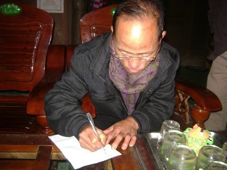 | Ông Lầu Ga Long (trưởng bản Trường Sơn, xã Nậm Cắn) ngày nào cũng ký xác nhận cho hơn chục hộ bán trâu bò. |