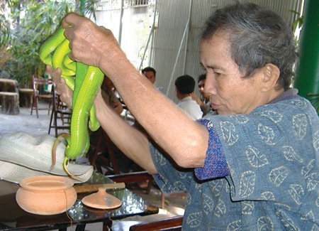 Nói đoạn, ông chuyển sang tôi và mấy người khách: “Không tin… ráy thử coi?!” Thiệt là hết biết! Tôi và mấy ông khách né chạy thục mạng. Có người hỏi “Không sợ rắn độc cắn à?”, ông đáp tỉnh queo: “Tui có uống thuốc trị rồi, không sao! Loại thuốc gia truyền trị độc này được chế cũng chính từ nọc rắn”.