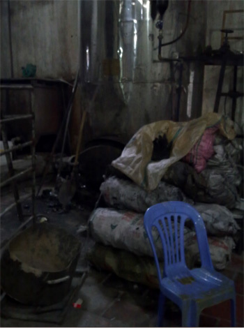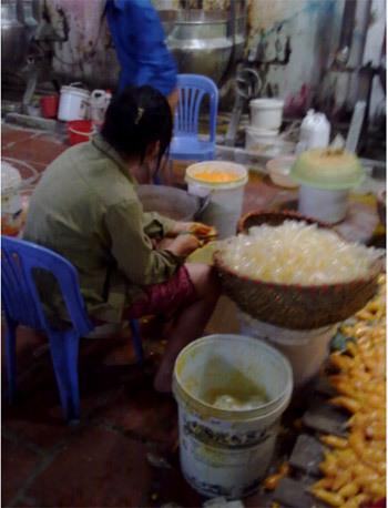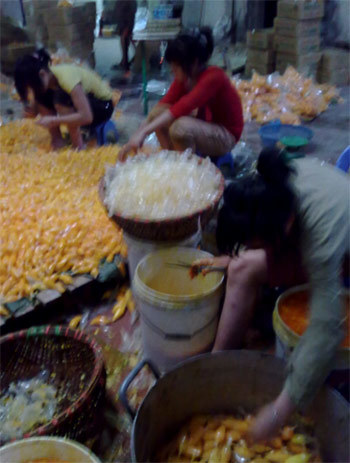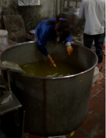 của các công nhân nữ bóp, nặn và gom vào một cái thùng cũ, bám đầy cặn đen,