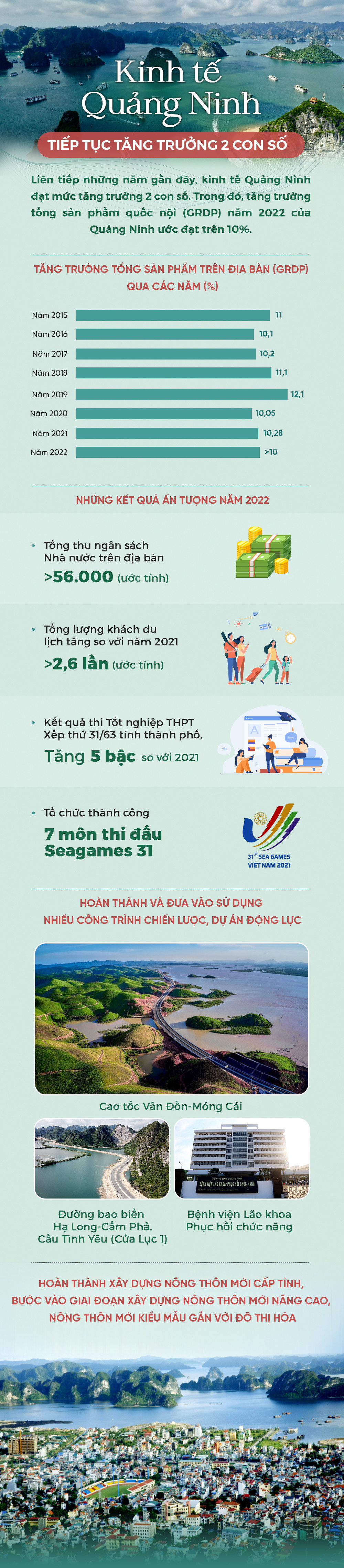 Liên tiếp những năm gần đây, kinh tế Quảng Ninh đạt mức tăng trưởng 2 con số. Trong đó, tăng trưởng tổng sản phẩm quốc nội (GRDP) năm 2022 của Quảng Ninh ước đạt trên 10%.